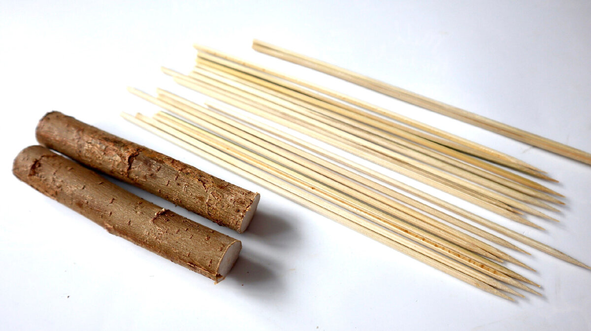 Сегодня хочу показать, как сделать подобное изделие из простых материалов, не потратив на это ни копейки. Она будет сделана из пары веток и шпажек, которые есть почти в каждом доме. Можно использовать любые деревянные бруски подходящего диаметра.
