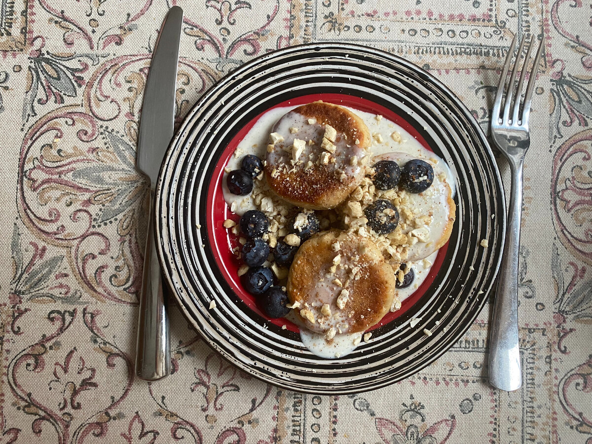 Завтрак 12.30 Наученная горьким опытом четверга, я решила не экспериментировать и начать пятницу с проверенных и вкусных блюд. На завтрак были сырники с кокосовым кремом, голубикой и кешью. Я долгое время раньше жарила сырники на слишком сильном огне, и лишь недавно осознала, что получается куда вкуснее, если делать на медленном и под крышкой. На 350 грамм творога пятипроцентной жирности кладу две ложки муки и ложку тростникового сахара. Правда, часто ленюсь перетирать творог, отчего сырнички опускаются по градусу нежности. В этот день муж в офис не поехал, так что было время съездить по разным насущным делам и заняться решением вечно откладываемых вопросов. И самый главный касался недавно сломавшейся посудомойной машинки. К хорошему привыкаешь исключительно быстро, и когда даже на время лишаешься своих бытовых помощников, то на глаза невольно наворачиваются слезы. Первый мастер неправильно диагностировал проблему дней пять назад, в машинке опять стала скапливаться воды, и мы похвал