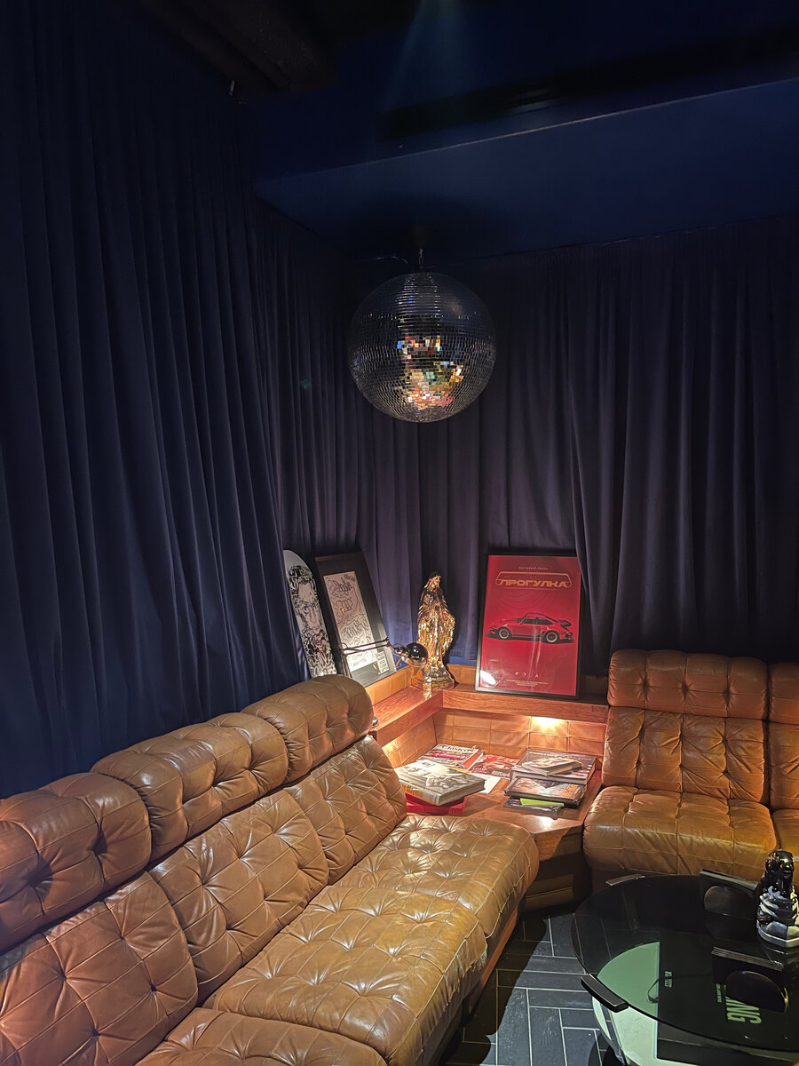 Кривоколенный переулок 7, -1 этаж ресторана Flaner +7 996 964-69-99 В подвале ресторана Flaner есть отдельное место на минус 1 этаже, с большущей толстенной шумоизоляционной дверью, где можно послушать музыку на пластинках и бобинах. Атмосфера идеально подходит для ценителей музыки и коктейлей. Очень уютное место, где постарались с дизайном: красивые лампы, крутейший дискобол, супер удобные диванчики. Еды нет, только легкие закуски под коктейли Карамелизированные пряные орехи, 310₽, норм Домашний микс оливок, 320₽, норм, но мало. Ростбиф, чимичурри из сельдерея, томатная сальса, 680₽, хорош Хала с соусами, 220₽, пойдет, но я бы наверно использовал бы их фирменные лепешки. Мусс Flaner, 420₽, самый -самый вкусный, must have Раньше в этом месте был склад коньяка Арарат, по словам бармена. Удобная бронь c депозитом. Депозит на чел - 3300 ₽ Если вы захотите индивидуальные коктейльчики, то вам придется выкатить 1500₽ за один коктейль. Бронировать можно на 3 часа максимуму, потом тебя попрося