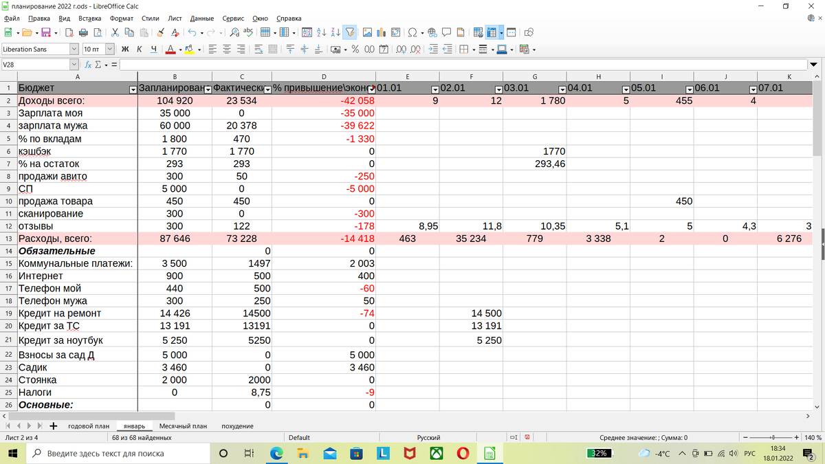 Приветствую дорогой читатель! Я уже писала, что с начала года начала вести отчет по доходам и расходам, дается мне пока трудно, нет привычки вечером садиться и заполнять. А потом можно не вспомнить и если пропустить неделю возвращаться будет точно лень, я себя знаю. В общем каждый вечер напоминаю себе про табличку. И каждый раз я слегка в шоке, мне кажется мы ничего не покупаем, но цифры не обманешь, они быстро разбивают розовые очки. Прошла половина месяца и пока табличка выглядит так: Начну с того, что раньше я не задумывалась о планировании, вернее всё было очень примерно и на глаз, поэтому я в ту или иную статью даже не знала сколько денег заложить. Уверена есть еще ошибок много, но пока явно в глаза не бросаются, сейчас у меня не большая каша получается, надеюсь постепенно выправиться. Надо распланировать точные суммы расходов, отложить на непредвиденные траты, ну и начать экономить хоть как то. А то пока только говорю. Сегодня зашли в магазин - 1000 р оставили и ведь мясного ни