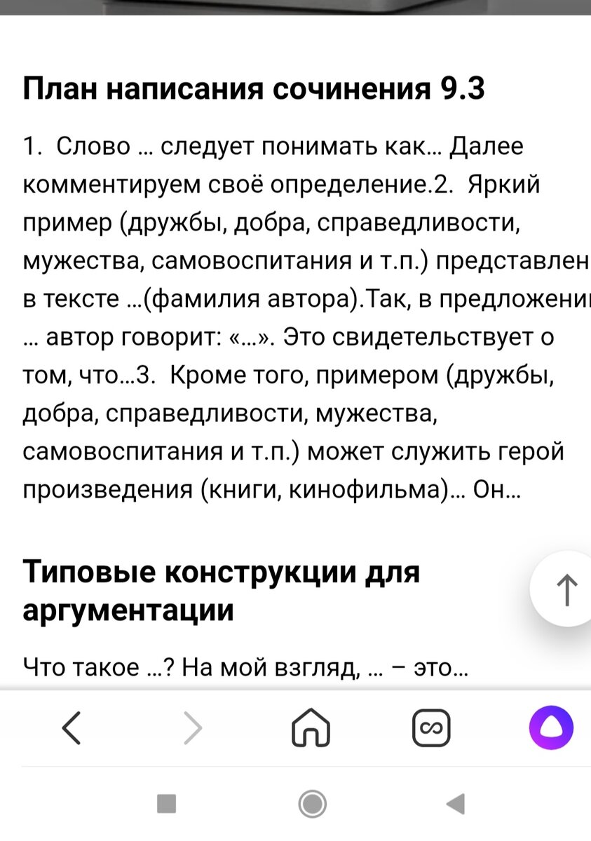 Всегда говорю и буду говорить, что сочинение - личное видение прочитанного, увиденного, пережитого... Писать надо по велению души.... А структура - дело наживное, да и, на мой взгляд, второстепенное. Кто сказал, что нельзя начинать сочинение с аргумента, плавно подводя его к тезису, или переплетая с ним? Читаешь на официальных сайтах рекомендации по написанию сочинения и приходишь в ужас! 1." Слово … следует понимать как… " Вот так начало сочинения!!! Следует понимать... Кому следует? Почему следует? Да ещё и "как." Начало прямо-таки красоты неописуемой. Фразища! 2. "Яркий пример (дружбы, добра, справедливости, мужества, самовоспитания и т.п.) представлен в тексте …(фамилия автора)." "Яркий пример"... Ярче не бывает. А попроще? Поинтереснее? Поспокойнее? 2.1 "Так, в предложении … автор говорит: «…». Это свидетельствует о том, что…" Зачем указательное наречие превращать в вводное слово? Зачем? Что за необходимость? Где плавность перехода? Излишнее нагромождение в пред