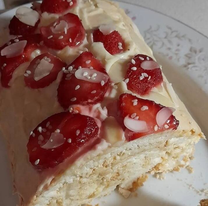 Друзья предлагаю Вам приготовить легкий и очень вкусный десерт! Сегодня он у меня с клубникой, но начинки могут быть самые разные от лимонной до ореховой, а может все совместить? В общем полет вкуса и фантазии не ограничен, готовьте, экспериментируйте, балуйте любимых людей вкусными блюдами! Ингредиенты: Тесто :, яичных белков, лимонная кислота, сахарного песка, кукурузной муки или крахмала, соли, лепестки миндаля, Крем:, яичных желтка, сахарного песка, молока, мука пшеничная, сливочное масло (масло можно заменить на творожный сыр), ванилин, Украшение :, клубника свежая, лепестки миндаля Способ приготовления: Тесто: Белки, сахар, лимонную кислоту взбить до устойчивых пиков. Добавить кукурузную муку и еще взбить. Тесто выложить на противень застеленный пергаментом и разровнять. Белковое тесто посыпать лепестками миндаля по вкусу. Выпекать в разогретой духовке до 150°С, 40- 50 мин. Крем: Яичные желтки взбить с сахаром в пышную белую пену. В полученную массу влить теплое молоко и перемеша