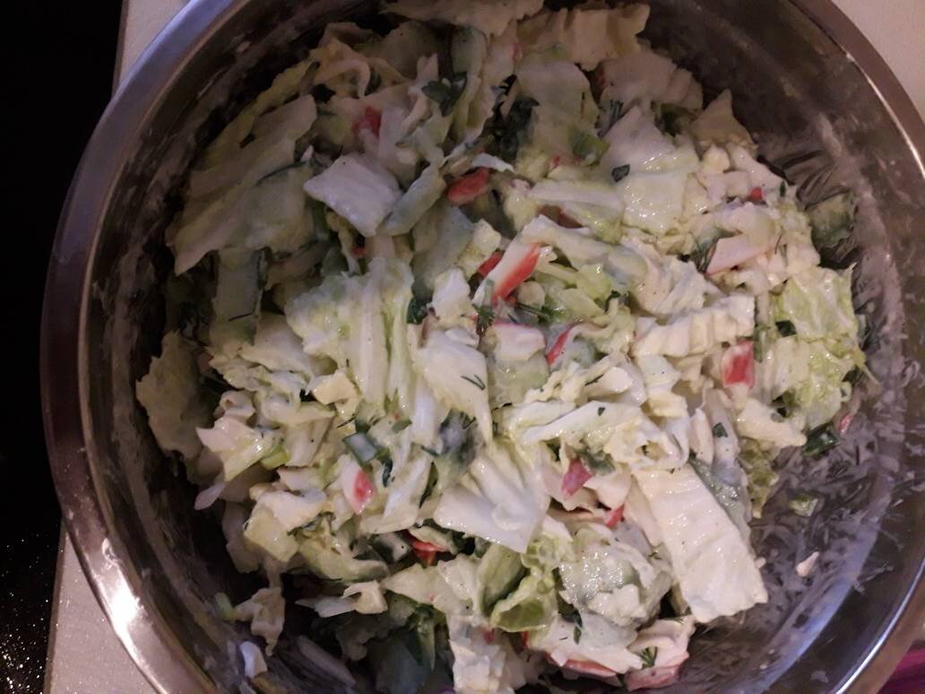 Ингредиенты: пекинской капусты, свежих огурца, крабового мяса или крабовых палочек, соль, перец, майонез для заправки Способ приготовления: Капусту режем на крупные кусочки. Огурцы трём на крупной терке. Крабовое мясо режем соломкой. Зелень мелко рубим, у меня зелёный лук, укроп и петрушка. Берите зелень которую любите. Все ингредиенты смешать в миске, посолить, поперчить и заправить майонезом. Приятного всем аппетита!