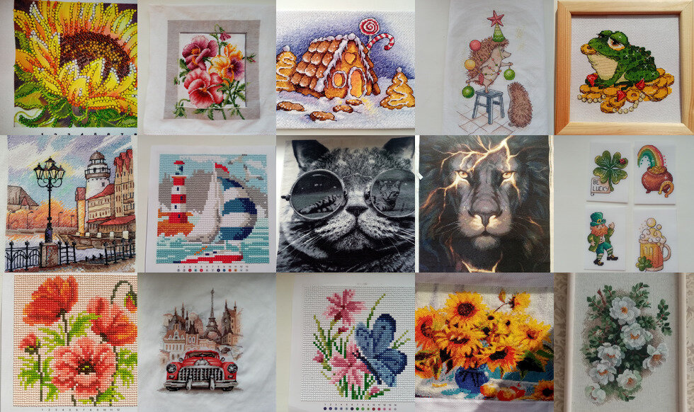 Всем привет. Наконец-то я нашла время, чтобы подвести некоторые итоги прошедшего рукодельного года. И у меня есть чем похвастаться. В прошлом году было 15 рукодельных финишей. Традиционно начну с алмазной мозаики. Главным алмазным финишем 2021 года стал Лев. Размер этого красавца - 50 на 70 см. Квадратные китайские стразы доставили, конечно, много хлопот, но результат потрясающий. А еще я развлекалась миниатюрными алмазными мозаиками из Фикс-прайса. Их я в прошлом году сделала 3 штуки. Они небольшие - примерно 16 на 16 см, а стразы в них круглые. Пара вечеров и финиш. Когда очень хочется финиша, а вышивальные "простынки" еще далеки от окончания, такая алмазка - отличный вариант. Вышивальные финиши 2021 В прошлом году я закончила 11 своих вышивок. Часть из них начинала еще в 2019 - 2020 годах. Самый главный финиш прошлого года - монохромный Кот от Химеры. Этот красавец вышивался 16 цветами (7 блендов) на 14-й белорусской канве. 93 000 крестиков и размер 50 на 50 см. Процесс вышивки
