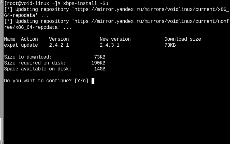https://mirror.yandex.ru/mirrors/voidlinux/ ЕС: Россия Чтобы заменить зеркало копируем всё чтобы можно было вернуть назад cp -r /usr/share/xbps.d /usr/share/xbps.d_old cd /usr/share/xbps.d И в файлах 00-repository-main.conf 10-repository-nonfree.conf Подставляе