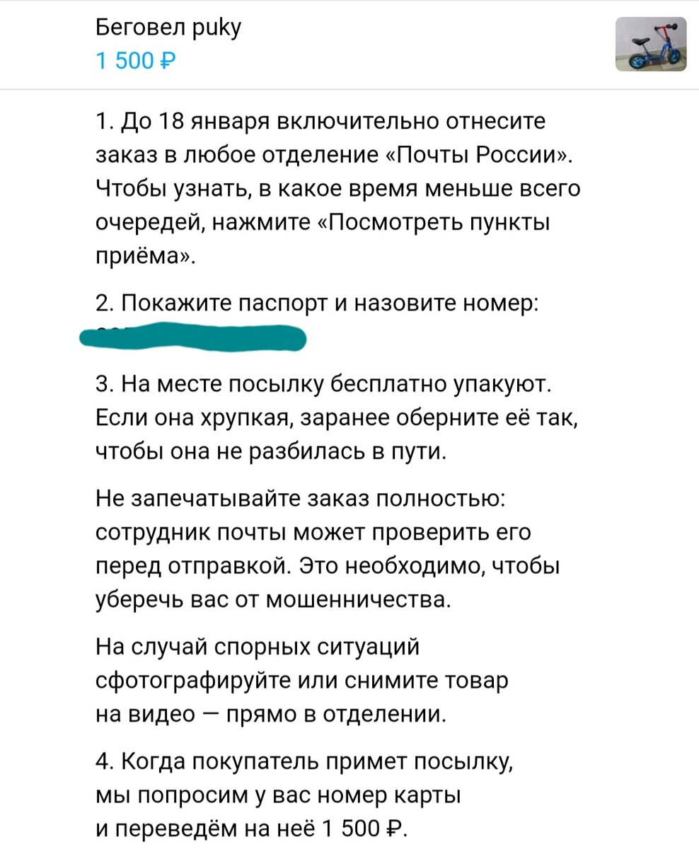 Много всего я продала на Авито за последние 8 лет, но вот с их доставкой столкнулась впервые. Недавно выставила на продажу беговел. Puky - неубиваемые беговелы, но младший сын как-то умудрился сломать у своего кончик сиденья. Из-за этого пришлось выставить его за 1500 рублей. Звонков по нему не было, да и не сезон. А на днях, мне пишет девушка из Тюмени и очень просит отправить ей беговел посылкой - на Авито есть такая услуга. Я с этим, повторюсь, никогда не сталкивалась и никогда ничего почтой не отправляла. Честно говоря, не хотелось заморачиваться из-за 1500... Но девушка, Виктория, даже мне позвонила. Сказала, что у них там такие беговелы не продаются, а им он очень пригодится. Оплата посылки будет за ее счет - мне нужно только прийти на почту с беговелом и оформить отправку. Я согласилась. Виктория все оформила и мне пришло вот такое сообщение с Авито: Ближайшее почтовое отделение у нас как раз находится по дороге в школу сына. Думаю, отправлю беговел и потом пойду за ним. В на