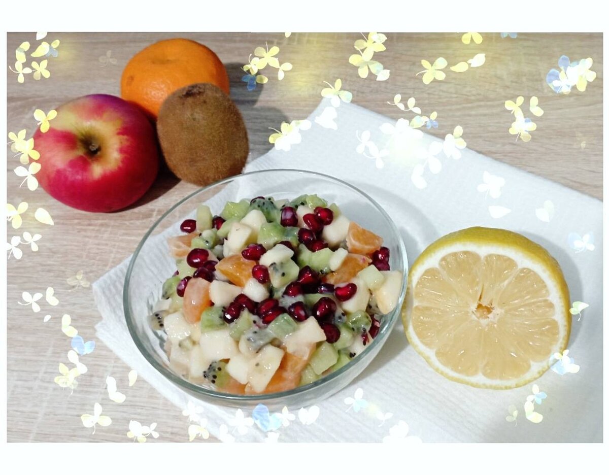 Ингредиенты: Киви, Яблоко, Банан, Мандарин, Гранат, Йогурт Способ приготовления: Нарезать фрукты кубиками, из граната достать немного зерен, заправить йогуртом, перемешать и сразу кушать! Никакого сахара! Вкусно и просто! Для детей и взрослых! 😋👍