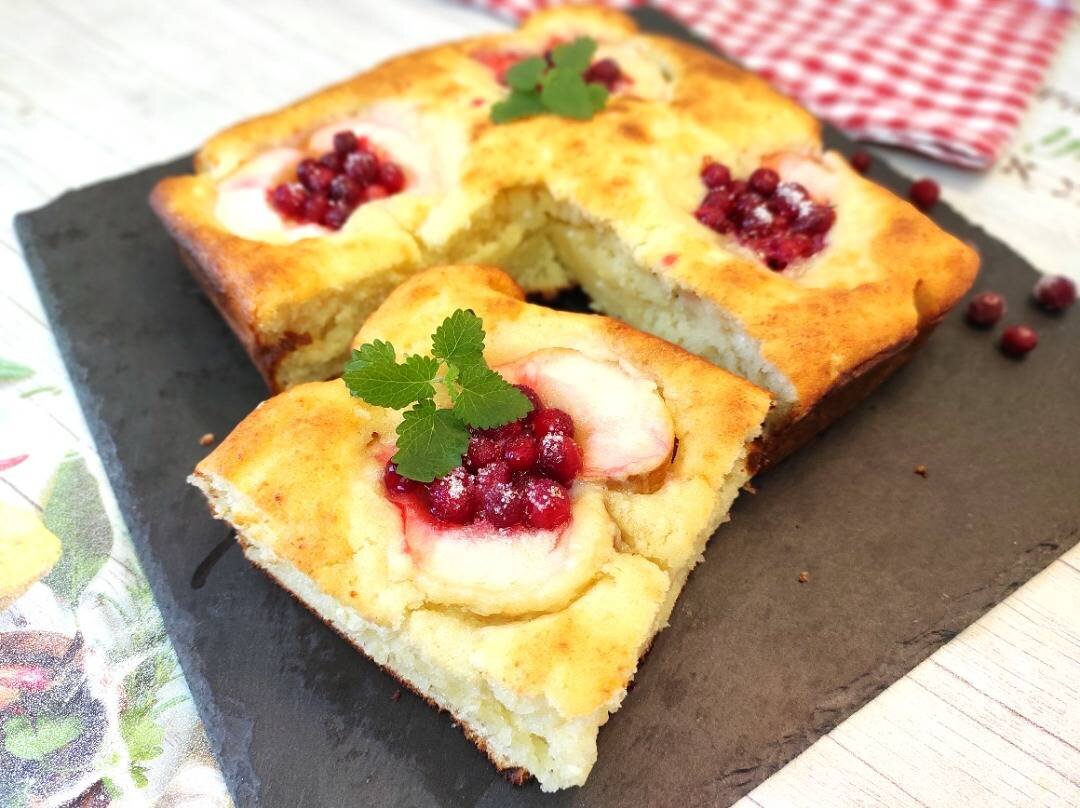 Пирог на творожном тесте с яблоками и клюквой - вкусная и простая выпечка. Пирог, приготовленный по этому рецепту получается очень вкусным, воздушным а запечённые яблоки с клюквой придают выпечке неповторимый аромат и сочность. #пирог Ингредиенты: Тесто:, Масло сливочное , Сахар , Мука , Разрыхлитель , Яйца , Творог , Начинка:, Яблоки , Клюква , Сахар Способ приготовления: Мягкое сливочное масло взбить с сахаром. Добавить творог и яйца. Перемешать. Добавить муку и разрыхлитель. Перемешать. Яблоки вымыть, разрезать пополам и удалить сердцевину. Тесто выложить в форму (у меня форма размерами 23*23 см) и равномерно его распределить. Яблоки выложить на тесто срезом вверх и немного утопить их в тесте. В середину выложить ягоды клюквы, если ягоды замороженные, то предварительно их размораживать не надо. Сверху посыпать сахаром. Выпекать в предварительно разогретой до 180 градусов духовке примерно 40 минут. Готовый пирог вынуть из формы, дать ему немного остыть, нарезать на порционные кусочки