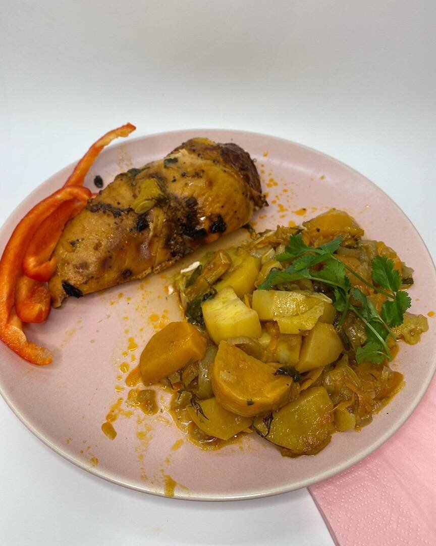 Ингредиенты: Целая курица, Чеснок, Смесь специй, Оливковое масло, Специи Способ приготовления: 1. Курицу хорошо моем, разрезаем вдоль 2. Смешиваем масло 3 ст. ложки со специями и смазываем курочку полностью 3. Чеснок я просто несколько зубчиков положила под курицу для аромата. 4. Отправляем форму в духовку на температуру 180 - 200 градусов на от часа до 2 часов в зависимости от размера курицы. 5. Подавать с рагу из картофеля и репы (рецепт есть в моих рецепта 😁)