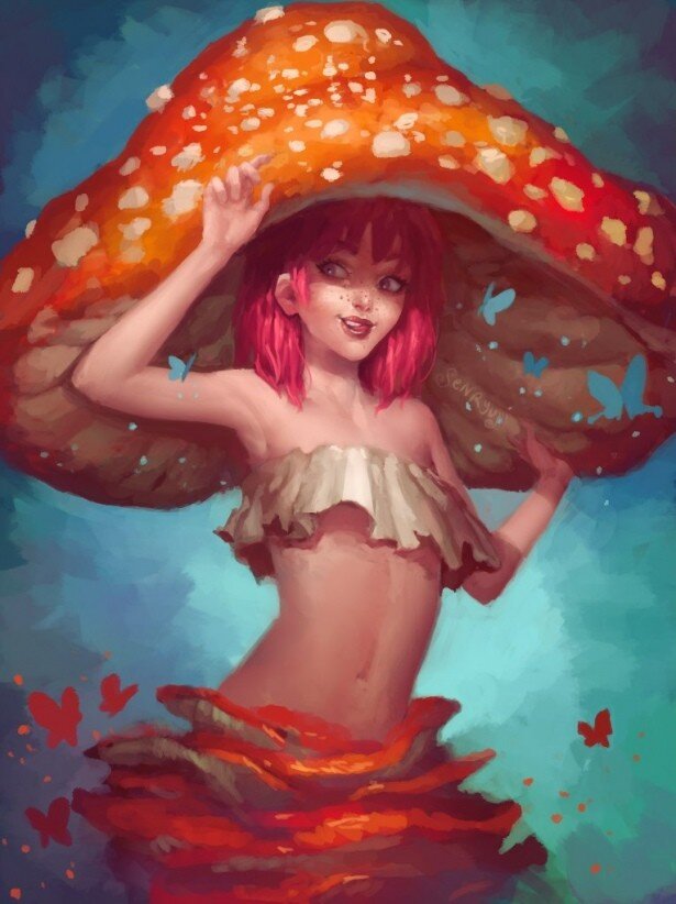 У ительменов есть сказка про дочь Великого Ворона Кутха по имени Синаневт, которая вышла замуж за Челькутха. А тот возьми да измени ей с девушками-мухоморами: "Жил-был Челькутх. Посватался он к дочери Кутха Синаневт, работал для нее, много дров приносил. Наконец женился на Синаневт. Стали они жить, много веселились. Родила Синаневт. Сын родился. Отправился Челькутх в лес, нашел красивых девушек-мухоморов и остался в лесу с девушками, жену свою забыл." Ну, понятное дело, мало кто может устоять перед очарованием мухоморов 😐 Особенно мухоморов женского пола. Пару раз Синаневт посылала к загулявшему папаше сына, но тот только побил его ремнём и ожёг головешками (отец года просто): "Услышал Челькутх, как сын поет, рассердился: — Пойдите, девушки, выпорите его ремнем как следует и огнем жгите. Пусть перестанет сюда ходить! Взяли девушки огонь, взяли ремень, стала стегать мальчика, огнем жечь. Потом прогнали его." Тогда Синаневт забрала сына и заодно всех лесных зверей и забралась с н