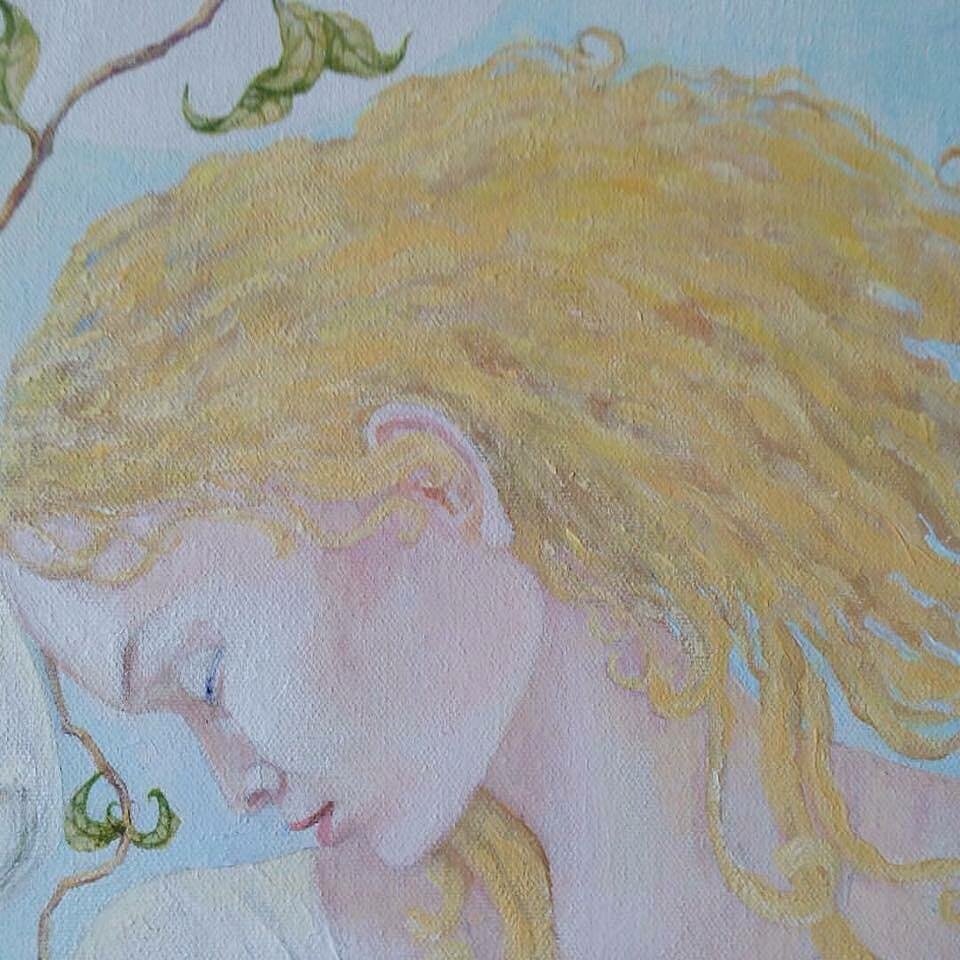У неё над головой огромное солнце, но оно стало белым, как платье героини, как знак чистоты и прощения, она очень сильная духом, ирисы говорят об этом, один цветок волной взметнулся защитить ее. Две ветки яблони, одна в цвету, а на второй появляется яблоко - плод этой истории, который она получит через долгих четыре года! А пока сова пролетает под яблоком, неся ей мудрость и знания, которые она ищет и скоро получит, как награду за смелость и настойчивость.