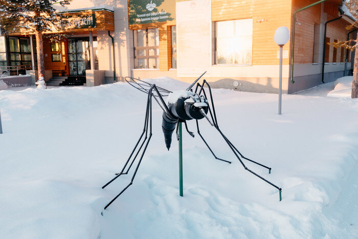 Я точно не самый большой любитель обычных музеев. Все сокрыто за стеклами, на любую попытку сфоткать прибегает бабуля-надсмотрщик с криком «НИЗЯЯЯЯ» или «кто разрешил!!». Да и смотрят на тебя как на похитителя музейных экспонатов(хуже смотрят только охранники в магазинах). А уж если экскурсовод скучный — то просто апокалипсис. Но бывают и другие музеи. В которых все иначе. Никакого бреда. Все чинно и благородно. Вот в таком музее и предлагаю вместе побывать. Отправляемся на север Сургутского района, где вдоль реки Тром-Аган и располагается деревня Русскинская Немного удивились памятнику на фото? Да-да это комар. Три года назад его установили у обновленного музея Природы и Человека. Сделан он (памятник, а не музей) из труб, штанги и арматуры. Оказывается, комарики это самая распространенная животина, обитающая в этих краях. И к нему особое отношение (хорошо,что сейчас зима, иначе меня сожрали бы там комары точно). Музею в этом году 34 годик исполняется. В далеком 1988 году его организов
