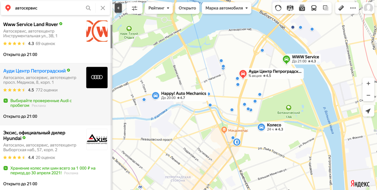 То есть по сути Вы будете "снимать сливки" и получать заявки от тех, кто прямо сейчас ищет СТО в Яндекс Картах. Карточка Вашей компании будет максимально удобной, информативной и привлекательной для потенциальный клиентов. На скрине ниже - пример того, как приоритетное размещение в Яндекс картах выглядит: