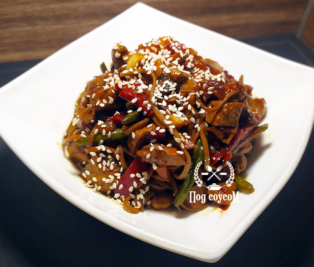 1. В кастрюле доводим до кипения воду и отвариваем лапшу по инструкции на упаковке. После этого воду необходимо слить, а лапшу откинуть на дуршлаг. 2. Мясо нарезаем небольшими кусочками, чеснок измельчаем до любимой консистенции. 3. В разогретой сковороде с маслом обжариваем мясо в течении 7 минут на сильном огне, постоянно помешивая. 4. Добавляем к мясу овощи и не убавляя огня обжариваем все вместе около 5 минут. Добавляем чеснок. 5. Приправляем любимыми специями, я использовал красный перец хлопьями, черный молотый перец и немного сушеного чеснока. Так же добавляем перцовую пасту,