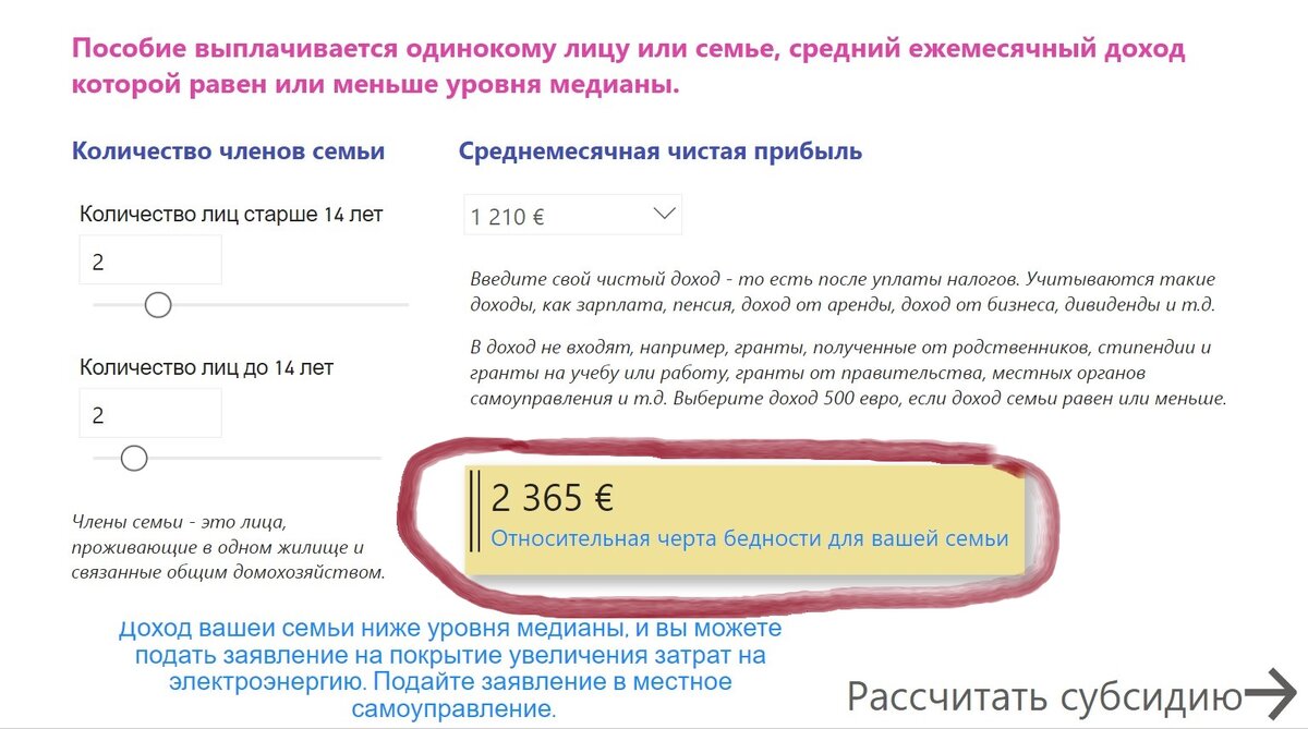 Как известно, в Эстонии — энергетический кризис. Коммунальные счета выросли очень чувствительно — в несколько раз. Для смягчения роста цен на электроэнергию со стороны государства было разработано несколько мер. Всем потребителям положено частичное возмещение платы за газ и электроэнергию. Семьям с доходами ниже среднего уровня помогают дополнительно. В Интернете есть калькулятор, с помощью которого можно понять, имеет ли право семья на допкомпенсацию. Эмигрицепс потестил калькулятор и выяснил: относительная черта бедности семьи с двумя детьми до 14 лет - 2365 евро… 205 тысяч рублей, так на минуточку! Вот это черта бедности! Сразу же вспомнились слова Владимира Путина, который в 2020 году объявил о том, что 70% жителей относятся к среднему классу, так как получают… больше 17 тыс. рублей. Эстонская черта бедности Эмигрицепсу нравится больше, чем российские 17 тысяч для среднего класса. 😂 😂 А вам? Подписывайтесь на телеграм-канал Эмигрицепс, там много интересного!