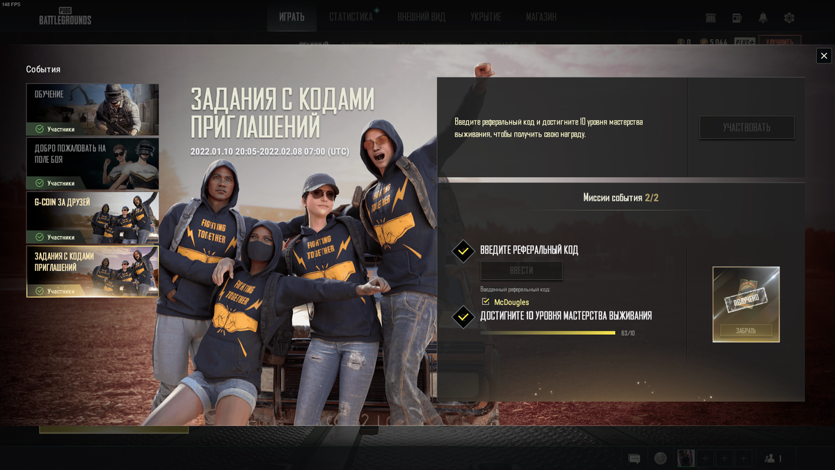 Мы подскажем рабочий реферальный код для PUBG: BATTLEGROUNDS. С помощью данного кода вы получите награду, а именно "КОНТРАБАНДЫ х10" , после чего за них можно купить кейс и получить бесплатно рандомную вещь. Вот код: 69607-16701 Вот код: 69607-16701 Для получения награды нужно достичь 10 уровня в игре, это очень быстро, буквально пару боев и все. На этом все, особо говорить о реферальном коде больше нечего. Вводите код и наслаждайтесь игрой!