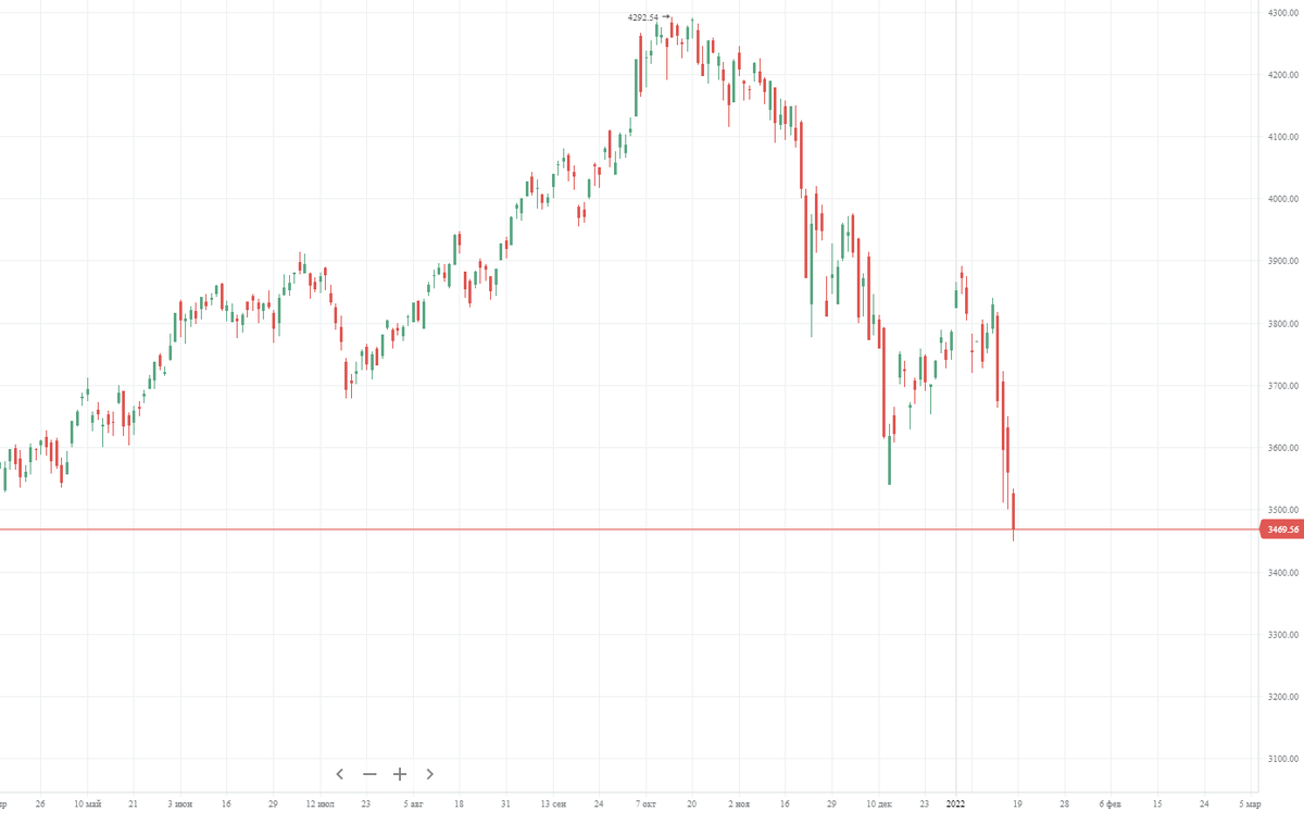 Это случилось опять. Очередной виток геополитического противостояния и, как следствие, очередное падение российских фондовых рынков 📉. Инвесторы, которые предпочитают вкладываться во все отечественное и игнорируют иностранные активы попали на тройное комбо: 1️⃣ Падение российского фондового рынка. Индекс Мосбиржи, в который входит 50 наиболее ликвидных российских компаний, просел на 17% от пиковых значений октября. 2️⃣ Падение курса рубля. Родненький сдулся к доллару на 10% за три месяца. 3️⃣ Растущая инфляция. Только официальный показатель за 2021 год превысил 8%, но мы ведь чувствуем по ценам на необходимые нам товары, что дела еще хуже. Можно ли было этого ожидать? Еще бы. Подобные обвалы из-за обострения в геополитике происходят на нашем рынке регулярно — раз в несколько лет. Вот почему важно диверсифицировать портфель. Существенную часть активов держать в иностранных активах развитых рынков, привязанных в твердой валюте. А для тех, кто давно придерживается этого принципа, возможн