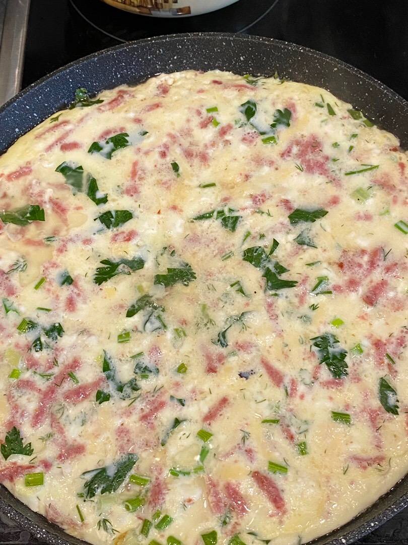 Вариант очень вкусного и сытного завтрака. Ингредиенты: творога, молока, яиц, колбасы или ветчины, сыра, Зеленый лук, укроп, петрушка, Соль Способ приготовления: Соединить творог с молоком, перемешать до однородной массы. Добавить яйца, соль. Перемешать блендером. Колбасу и сыр натереть на крупной терке. Все соединить. Вылить смесь на сковороду, прикрыть крышкой и готовить на маленьком огне до готовности.