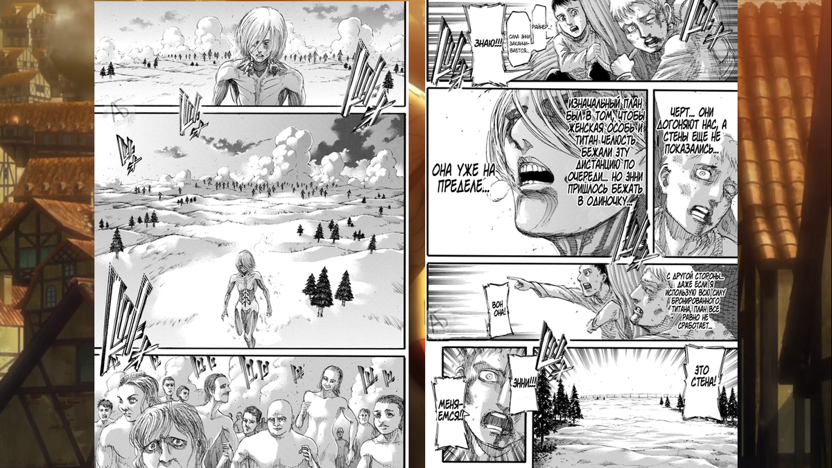 К тому же, в манге подтверждается догадка, высказанная ещё в первом сезоне, ведь нам демонстрируют как Энни криком созвала чистых титанов, которые устремились прямо за ней, а потом разом ворвались в город.