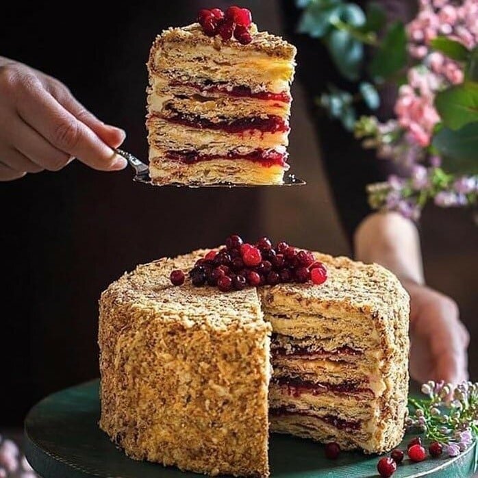⠀ ИНГРЕДИЕНТЫ НА ТОРТ 18 СМ: 🔸Для теста: ✅350 гр масла (или маргарина Пышка) ✅400 гр муки ✅150 мл ледяной воды ⠀ 🔸Для начинки: ✅Пачка сливочного масла (180 гр) ✅1/2 банки сгущенки (густой) ✅Брусничное варенье ⠀ Хотите научиться готовить так 👆🏻 и даже лучше? Ссылка на обучение для кондитеров в шапке моего профиля 👆🏻 ⠀ ПРИГОТОВЛЕНИЕ: 1) Достаем из морозилки маргарин (масло) и натираем его на терке, быстренько, пока не начало размягчаться добавляем просеянную через сито муку и рубим острым ножом. ⠀ 2) Затем добавляем воду по чуть-чуть и снова рубим, вымешиваем однородное тесто, делим на 8 равных шариков и кладем в морозилку минут на 30. ⠀ 3) Затем достаем по одному шарику, раскатываем тонко, тарелкой вырезаем круг (диам.18 см), делаем вилкой наколы в нескольких местах и отправляем в разогретую до 200 гр духовку. Пропекаем каждый корж до золотистого цвета. ⠀ 4) Коржи доставайте очень аккуратно, так как они получаются очень воздушными, рассыпчатыми, хрупкими и с пузырьками. Оставшиес