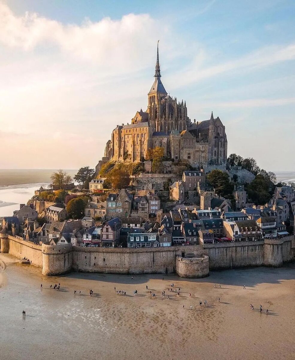 Мон-Сен-Мишель – остров-крепость, поднимающийся над необъятными песками в Нормандии, на северо-западе Франции. Достопримечательность пользуется любовью туристов – ее посещает около 3 млн человек в год (больше интереса проявляют только к Парижу). В Мон-Сен-Мишель можно своими глазами увидеть мощные приливы и отливы, пройтись по древним улочкам и полюбоваться на восхитительные виды. Во время прилива это место становится островом, который почти полностью отрезан от материка. Только дамба, построенная в конце XIX века, сохраняет связь с аббатством. Во время отлива вода уходит и территория Мон-Сен-Мишель становится обычной частью материка. Стены, утес и строения аббатства создают целостное впечатление. Высота от среднего уровня моря до верхушки шпиля церкви – 170 м. Замок Мон-Сен-Мишель многим покажется знакомым: он стал прообразом крепости в фильме «Властелин Колец». Объект появился не в оборонительных целях и не для развлечения знати – он основан как монастырь. Старинный замок видел и мон