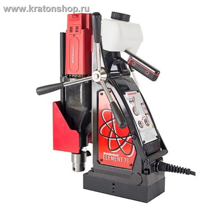 Характеристики двигателя 230 В, 4А, 1800 Вт Макс. скорость вращения шпинделя без нагрузки 1скорость70-180об/мин 2скорость200-500об/мин Макс. диаметр сверления корончатым сверлом 75 мм Макс. диаметр сверления спиральным сверлом 26 мм Глубина сверления 75 мм Зенкерование 10-55 мм Шпиндель Вал конус Морзе №3 Площадь магнита 220х114 мм Сила магнитного сцепления 1850 кг Внешние размеры, макс (ВхШхД) 545х230х460 мм Вес 22,8 кг Магнитный станок Element 75 - с модернизированным редуктором и инновационной системой защиты от перегруза, возникающего из-за излишнего давления на сверло. Максимальный диаметр и глубина сверления достигают 75 мм. Может применяться для спирального сверления и зенкерования. Доступно две скорости эксплуатации, которые плавно регулируются (70-180 об/мин и 200-500 об/мин). Установлен мощный магнит с прижимной силой 1850 кг, оснащённый индикацией текущих параметров работы. Есть система автоматической подачи жидкости для охлаждения. Эргономичная конструкция со съёмной трансп