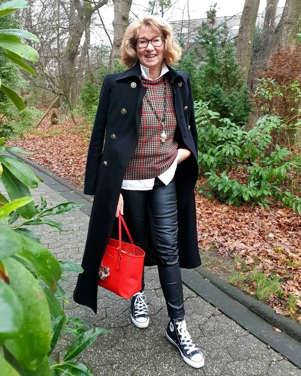 Многие женщины, перешагнув 60-летний рубеж, переходят в категорию «невидимок». Они носят мешковатую одежду, составляют максимально незаметные, стандартные образы. А зря, ведь в любом возрасте есть место для современных тенденций, стиля и красоты! Возраст – не повод отказываться от кожаных вещей. Брюки из натуральной кожи или качественного эко-заменителя отлично вписываются в расслабленные образы в стиле кэжуал. Соедините их с джемпером, белой рубашкой, пальто. Удобные кеды и вместительная сумка сделают образ практичнее. Не хуже на зрелой даме будет смотреться кожаная юбка-миди. Юбка из кожи – это самодостаточный предмет гардероба, поэтому образ лучше дополнять простыми и понятными вещами, такими как жакет, блуза, базовые аксессуары. Освежающий мятный оттенок выгодно омолаживает зрелую внешность. Жакет отлично ладит с белой водолазкой и укороченными брюками-клеш. Модный тандем можно дополнить белыми кедами, которые гармонично вписываются в любой стиль одежды. Двухцветный образ смотрится