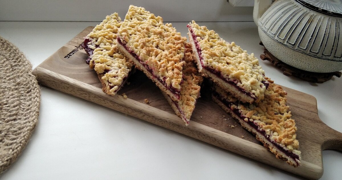 Песочная основа, прослойка джема и тертая крошка из теста! Сегодня предлагаю вам приготовить вкусное венское печенье, или как мы привыкли называть – тёртый пирог. И начнём мы с приготовления вишнёвой начинки. Как альтернативу, можно использовать ваш любимый джем. Ингредиенты для вишневой начинки: 400 гр. замороженной вишни 150 гр. сахара 2-3 ч. л. сока лимона 30 гр. кукурузного крахмала Все ингредиенты пробить блендером до состояния кашицы. Далее переложить в сотейник с толстым дном и довести до кипения, постоянно помешивая. Снять с огня при появление первых пузырей. Начинку полностью остудить. Ингредиенты для теста: 550 гр. муки 150 гр. сахара 1/4 ч. л. соли 5 гр. разрыхлителя 240 гр. сливочного масло 2 яйца Муку, сахар, соль, разрыхлитель перемешиваем и добавляем холодное масло. Перетираем все до состояния крошки. Удобно это сделать, используя кухонный комбайн. Но чаще, всё же, я перетираю всё руками. Далее добавляем яйца и объединяем в общий ком теста. Месить долго не надо, чтобы м
