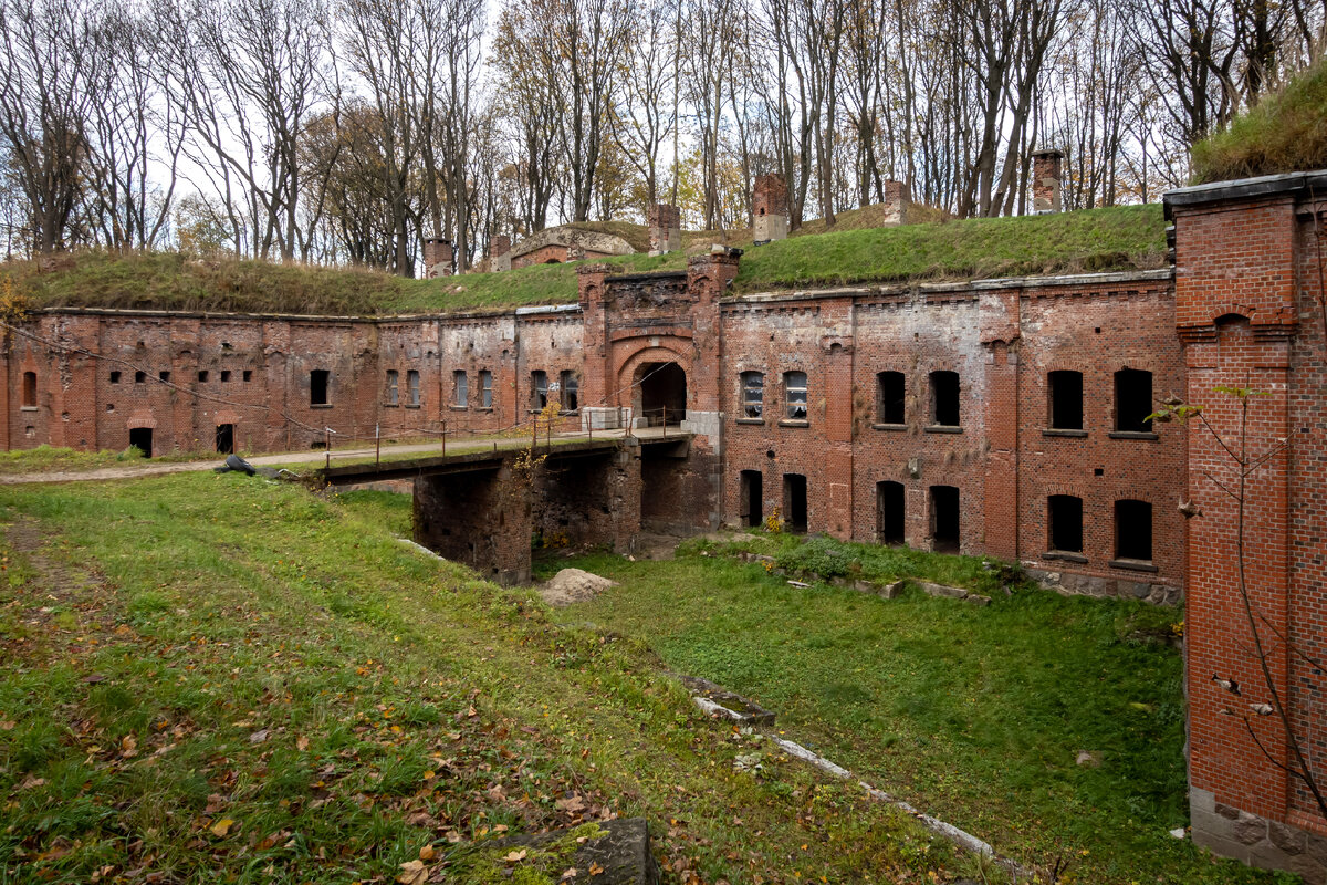 «Знаете, какое главное развлечение у нас в детстве было? Мы с другими мальчишками лазили по фортам. Собирались, брали фонарики, и вперёд — приключение же. В войнушку, конечно, там играли. Как ничего себе не переломали, не знаю — свалиться же запросто в этих подземельях». Это нам рассказывал таксист по пути к форту №3... ...и удивлялся, зачем мы туда едем — закрыт же. Но ведь сохранился очень хорошо, да и по размеру самый крупный среди своих 15 собратьев. Поэтому мы его пропустить и не могли. Вышли из машины и пошли к воротам. На них обнаружили действительно замок... ...а ещё табличку про реставрацию. Хотя никаких работ не заметили. Но размер оценили в полной мере: представьте себе футбольное поле — оно ведь большое, а теперь 8 таких полей сразу — это и будет форт №3. Его площадь — 63 тысячи квадратных метров. А мы, такие отважные, решили обойти вокруг... ...чтобы хоть снаружи всё осмотреть. Притомились, конечно. По пути я представляла себе солдат, которые тут служили за зловещей ог