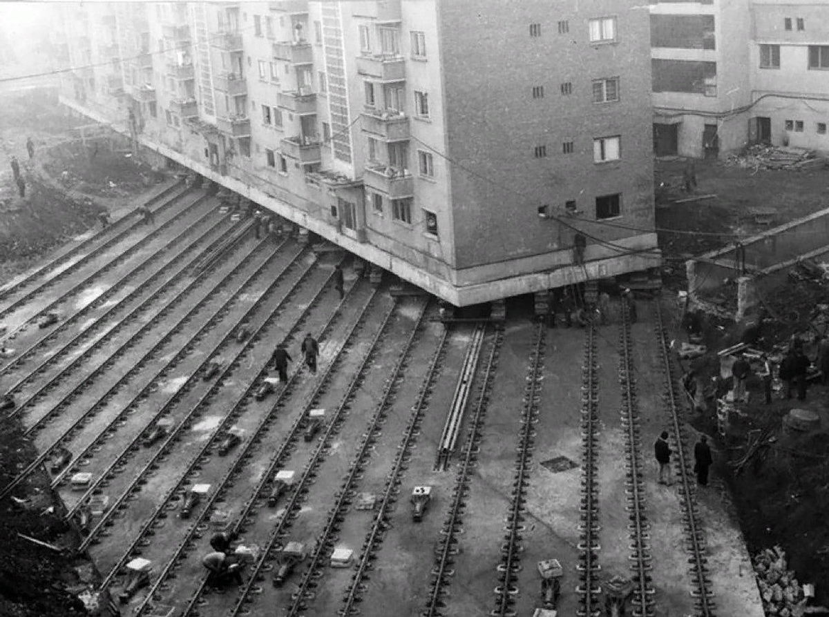 Перемещение 7600-тонного многоквартирного жилого здания, которое провели, чтобы проложить бульвар в румынском городе Алба-Юлия. Румыния, 1987 год.
