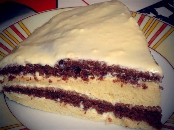 Испечь 2 коржа, остудить и разрезать острым ножом на 2. Крем: