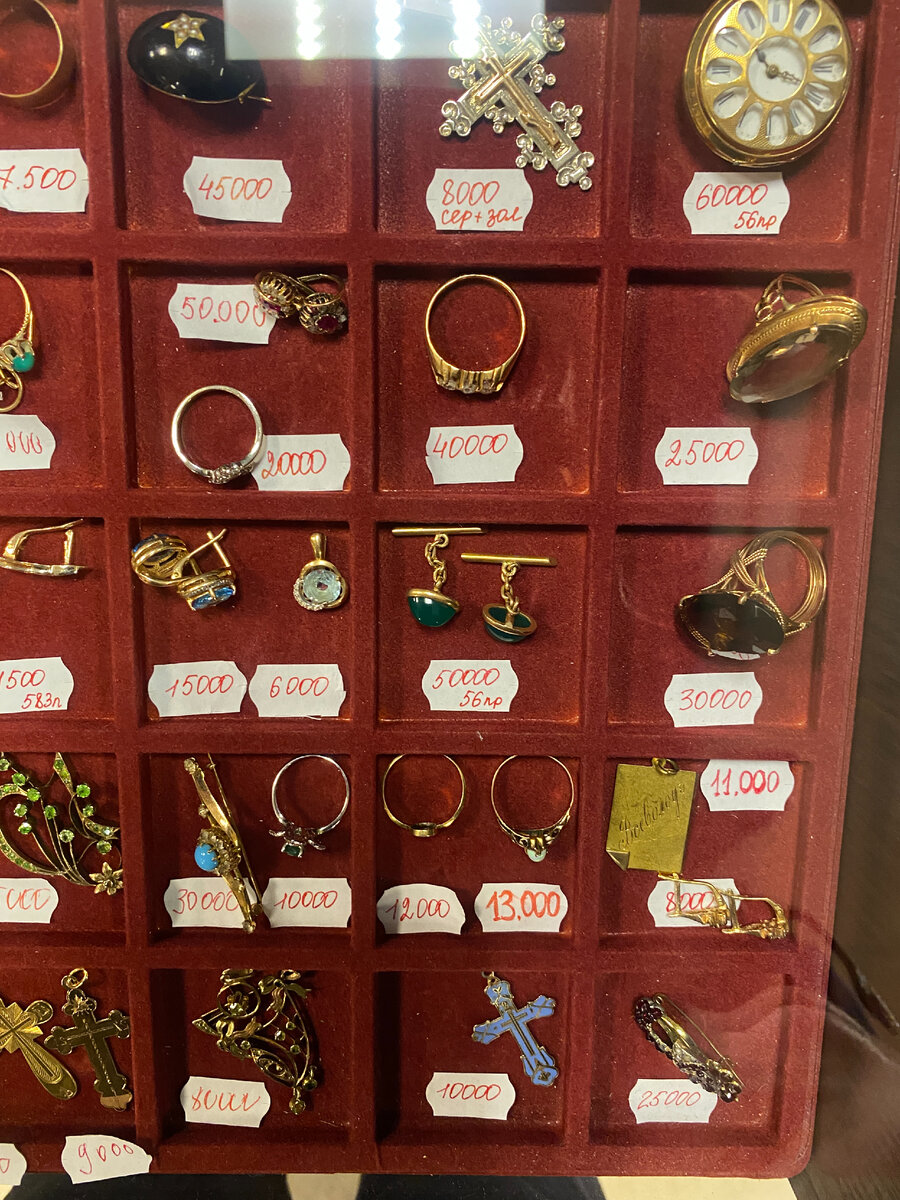 Всем привет. Вчера посетил один антикварный магазин, что находится в центре Казани. Довольно интересная экскурсия у меня получилась. По просьбе читателей, решил акцентировать внимание, на витрине, где лежали изделия из драгметаллов. Это женские часы, 56, еще царской пробы: Монисто - украшение из серебряных (обычно) монет: Брошь-подвеска, тех еще времен: А это... Запонки? Это - подвеска: Перстни, вроде советские: Общий вид: Монеты : Золотых - две царского периода и современная: Серебряная визитница: Часы-табакерки: Видно немножко портсигаров, тоже из серебра: Иконы литые: Портсигары покрупнее: Монисто покрупнее: Ну и по традиции - видеообзор, того-же самого. С уважением, Евгений Хрусталев.