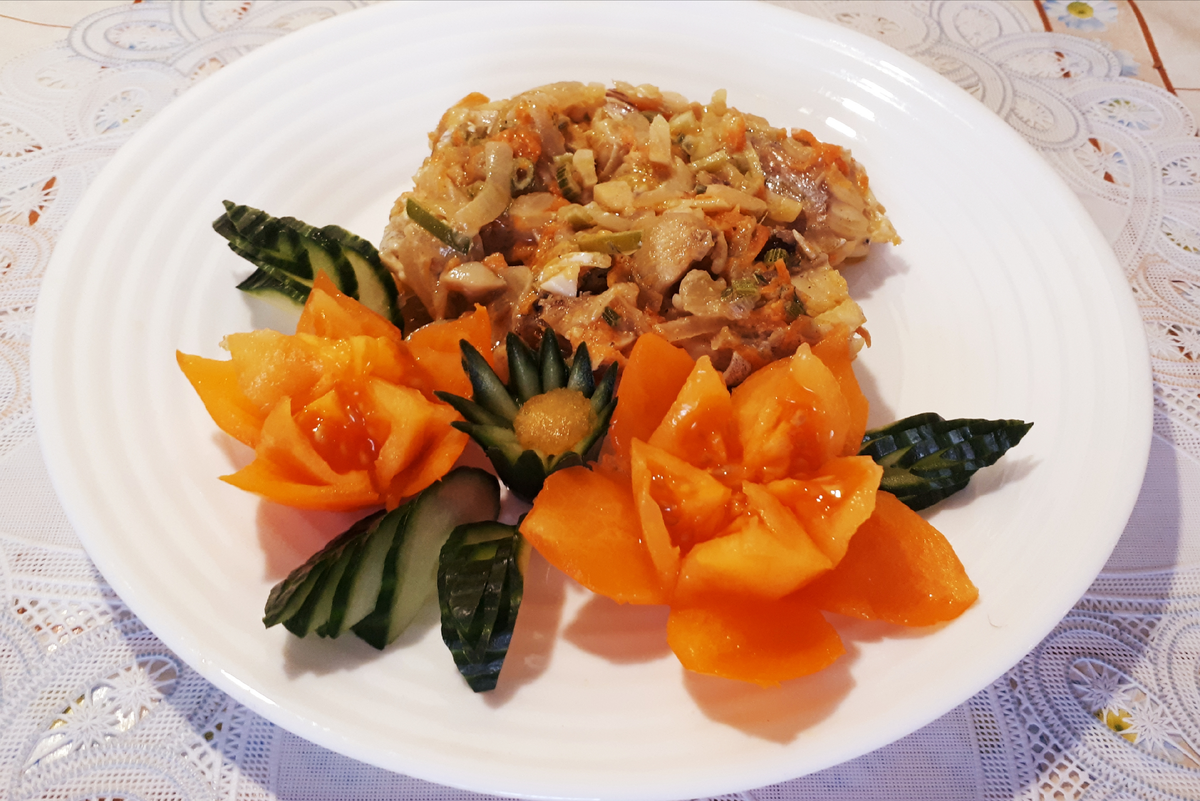 Мы все привыкли к тому, что вкусные рыбные блюда обычно делаются из дорогой красной рыбы: форели, семги, но можно приготовить оригинальное блюдо также из недорогой белой рыбы, например, из минтая. Хочу поделиться с вами рецептом. Нам потребуются такие простые продукты как морковь, лук репчатый, минтай, масло подсолнечное, зелень, чеснок, перец чили и майонез. Решила сходить в магазин за сливками, пока ходила в магазине в холодильнике увидела рыбу, первый пакет взяла, смотрю чистое филе, но много льда, следующий пакет точно такая же упаковка, но цена ниже, минтай как в советское время, с плавниками, хвост, правда внутренностей не было. Вспомнила как мы готовили раньше рыбу и решила приготовить. В пакете всего три рыбы, средненькие, думала 150 рублей будет, дома посмотрела чек, всего 75 рублей. Выложила из пакета две рыбки, одну оставила на другой раз. Помыла, отрезала плавники и хвост, удалила черную пленку, иначе рыба будет горькая. Нарезала под углом, посолила, поперчила, брызгал