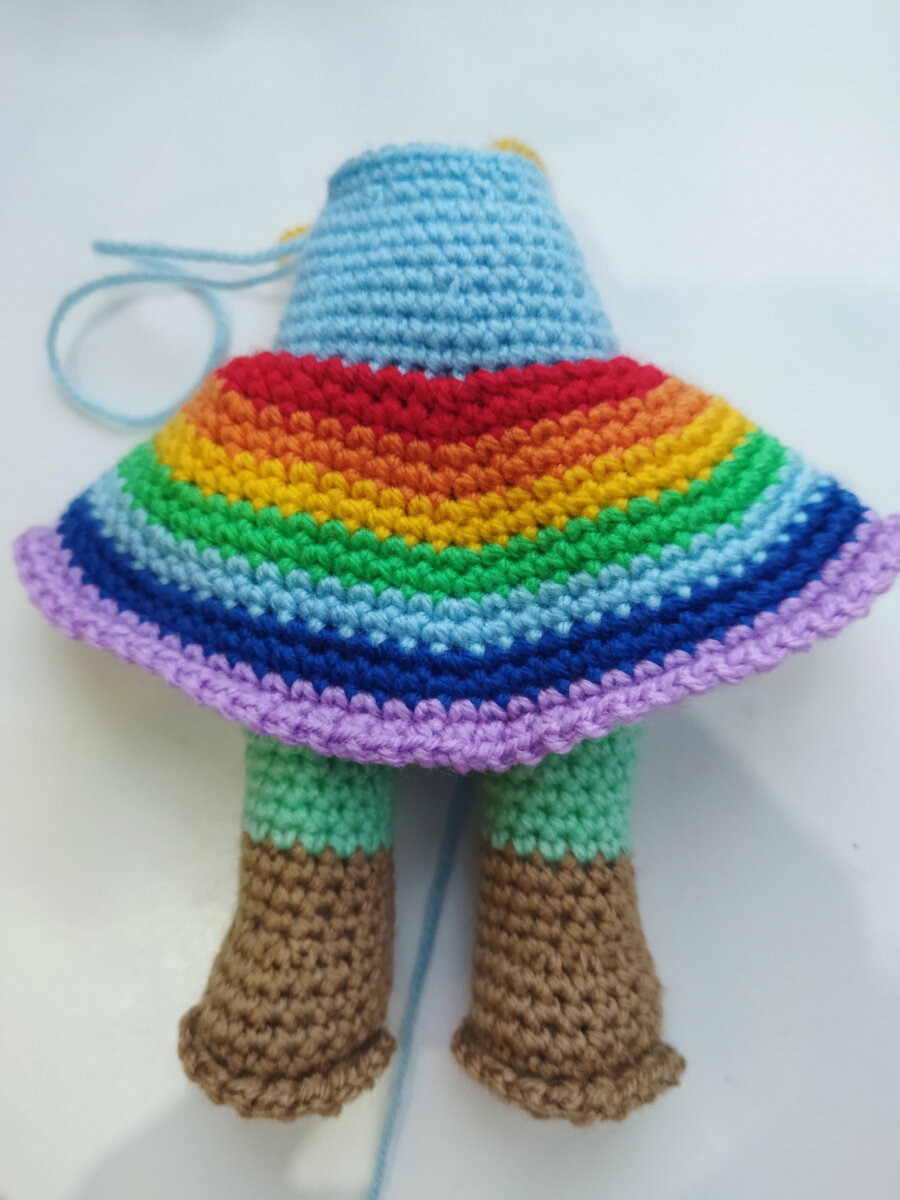 Тело. Соединяем две ножки 3 в.п пряжей голубого цвета. Куклу набиваем в процессе вязания. 1)Начинаем с правой ножки. Ищем середину сбоку,вводим крючок,вводим крючок,делаем 3 в.п и соединяем с левой ножкой соед.ст. Далее по левой ножке вяжем 15 ст,3 ст по 3 в.п спереди,затем 15 ст,3 ст по 3 в.п.(36) 2)5 ст,пр-6 раз(42) 3,4,5)3 ряда по 42 ст(42) 6)5 ст,уб- 6 раз(36) 7)36 ст(36) 8)за задние стенки 36 ст(36) 9,10)36 ст(36) 11)4 ст,уб-6 раз(30) 12,13,14)3 ряда по 30 ст(30) 15)3 ст,уб-6 раз(24) 16)24 ст(24) Куклу набить и вернемся к 8 ряду,где вязали за задние стенки и будем вязать юбочку.Берем пряжу цветов радуги.Все помнят считалку"Каждый охотник желает знать,где сидит фазан". Начинаем пряжей красного цвета.Держим куклу ножками от себя. 1)5 ст,пр-6 раз(42) 2)42ст(42) Оранжевая пряжа. 3)6 ст,пр-6раз(48) 4)48 ст(48) Желтый цвет. 5)7 ст,пр-6 раз(54) 6)54 ст(54) Зеленый цвет. 7)8 ст,пр-6 раз(60) 8)60 ст(60) Голубой цвет. 9)9 ст,пр-6 раз(66) 10)66 ст(66) Синий цвет 11)10 ст,пр-6 раз(72) 12)72