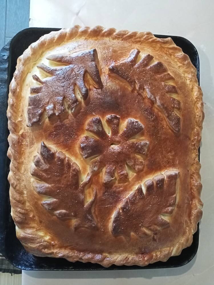 Ингредиенты: Для теста: , муки, дрожжей, соли, сахара, раст.масла, воды, Для начинки: , филе горбуши, рис, лук репчатый , соль, яйцо для смазывания Способ приготовления: Смешать муку, дрожжи, соль и сахар в миске, добавить теплую воду или молоко. Замесить тесто, подливая растительное масло, отправить в теплое место на 50-60 минут, периодически обминая. Для начинки: горбушу нарезать кубиком, вынимая косточки (если таковые имеются) Рис отварить до готовности, промыть, остудить. Лук нарезать мелким кубиком (ну или как больше нравится). Когда тесто подошло, разделить его на две части, раскатать пласт, уложить на противень. На тесто укладываем сначала рис, затем горбушу, немного посолить, сверху лук. Накрываем вторым пластом теста, защипываем края, украшаем по желанию. Смазываем яйцом. Печь, в разогретой до 190 градусов, духовке 30-40 минут. Приятного аппетита!