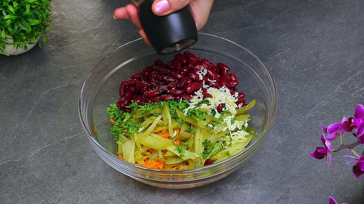 Сегодня готовлю яркий, сочный, простой по составу, а ещё и очень вкусный салат на каждый день. На его приготовление не нужно тратить много времени и сил, в нем нет ни мяса, не майонеза, а получается сытно, вкусно и экономно. Если еще не делали такой салат, приготовьте - этот вариант может стать достойной заменой "приевшимся" салатам и поможет внести разнообразие в повседневное меню. Необходимые ингредиенты и видеорецепт вы можете увидеть в конце статьи ⤵️⤵️⤵️ Приготовление: морковь натираю на терке для корейской морковки и нарезаю лук. Далее обжариваю лук с морковью на среднем огне, добавив немного растительного масла. Готовлю овощи несколько минут до мягкости, время от времени помешивая их. Обжаренные лук с морковью перекладываю в салатник. А пока они остывают, нарезаю огурцы на тонкие полоски и измельчаю петрушку. Отправляю в салатник к моркови с луком огурцы с петрушкой, добавляю фасоль и натираю на мелкой терке чеснок. Немного свежемолотого черного перца, хорошо перемешиваю, пр