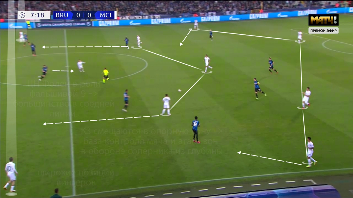 МанСити играет по схеме 4-3-3, которая в развитии атаки переходит в условные 2-3-5 или 2-3-1-4. В играх против Брюгге и МЮ (которые были использованы для анализа) Гвардиола использовал игрока в роли фальшивой девятки, который смещался в полузащиту и позволял получить преимущество в середине поля - свободного игрока в центре поля. В первой игре против Брюгге (оборонялись в 4-2-3-1) получалось успешно найти пространство между линиями опорных и атакующих полузащитников бельгийцев и время для оптимального варианта продолжения атаки. Ширину в атаке задавали вингеры в отличие от распространенного варианта с высокими крайними защитниками. Причем вингеры у Мансити занимают позиции почти на бровке, что позволяет создавать ситуацию 1-в-1 при быстром развитии атаки с передачей на фланг и может создать разрыв в линии защиты соперника, когда крайний защитник выходит на него и центральный остается. Если же центральный защитник соперника реагировал на маневр “фальшивой девятки” и следовал за нападаю