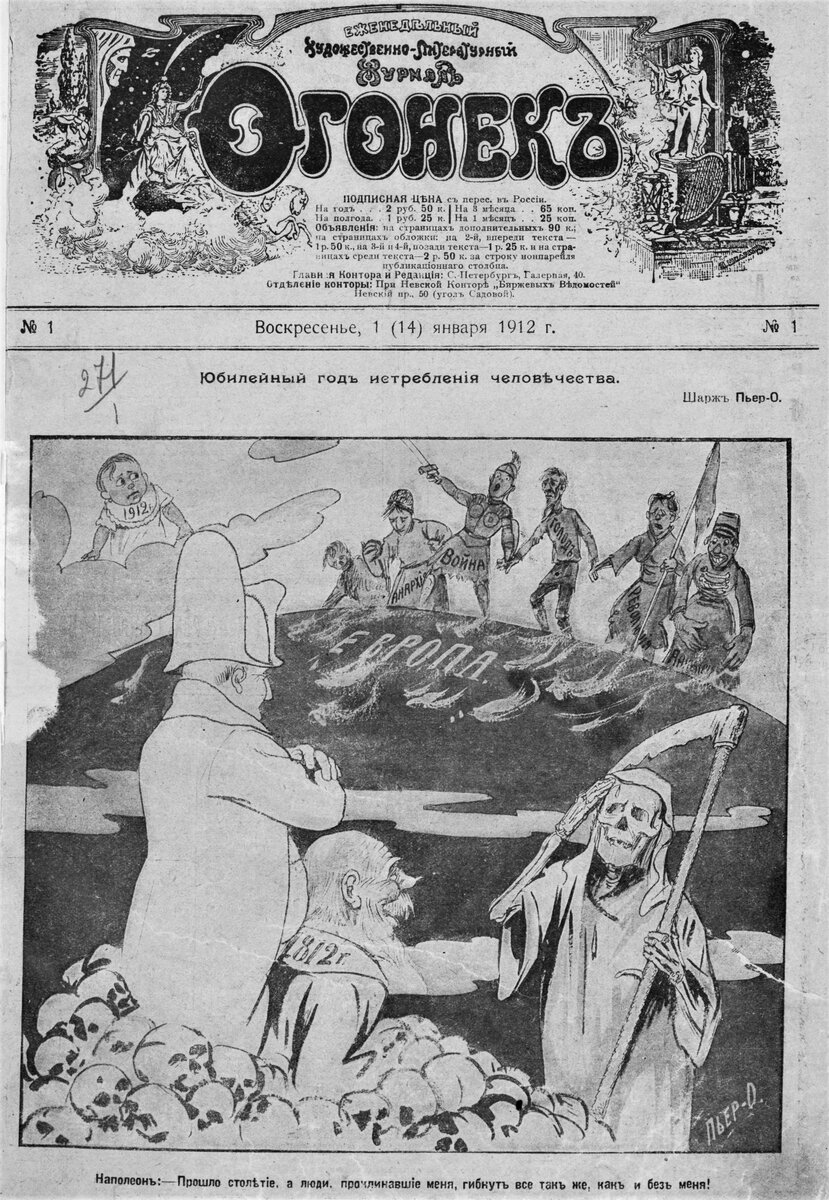 Огонёк издавался с 1899 года. Несколько статей из первого выпуска в 1912 году. Великосветский благотворительный базар. "Ежегодно передъ Рождествомъ огромный бѣлоколонный залъ Дворянскаго собранія и прилегающее къ нему фойе превращаются на три дня въ великосвѣтскій базаръ, объединяющій множество петербургскихъ благотворительныхъ обществъ. Кромѣ десяти столовъ Августѣйшей покровительницы базара Великой К нягини Маріи Павловны, на базарѣ красовалось 85 кіосковъ и столовъ различныхъ благотворительныхъ учрежденій..." Впечатления иностранца о базаре. "...Удивительнѣе же всего то, по крайней мѣрѣ для меня, что посѣщеніе великосвѣтскаго базара въ Петербургѣ стоило мнѣ всего нѣсколько десятковъ рублей. Знакомая дама, у которой я купилъ лакомствъ
