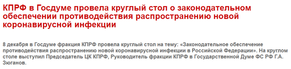 8 декабря коммунисты провели в Госдуме круглый стол, якобы посвященный вопросам борьбы с коронавирусом. Однако в действительности участниками данного мероприятия стал целый ряд экспертов и спикеров с сомнительной репутацией. Так, среди спикеров оказались 4 из 6 основных кандидатов на медицинскую номинацию премии «Почетный академик ВРАЛ»: Александр Редько, Мария Шукшина, Павел Воробьев и Игорь Гундаров. А 25 декабря ковид-мародера Александра Редько все-таки наградили статуэткой «Золотая Кофейная Клизма» и присвоили ему новое звание – «генералиссимус генетической безграмотности»: «Мы решили, что будет правильным присвоить ему еще и звание генералиссимуса генетической безграмотности. Даже вот такую разработали ксиву, которая напечатана с золотым отрезом, нестыдно будет уважаемым людям невзначай показать». Стоит отметить, что премия «Почетный Академик ВРАЛ» была учреждена в 2016 году и ежегодно вручается за выдающийся вклад в развитие и распространение лженауки и псевдонауки. А в 2021 году
