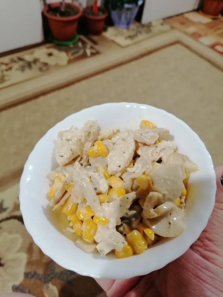 Ингредиенты: - консервированных грибов, - куриные грудки, - консервированной кукурузы, Майонез , Соль , Maggi на второе (листы для жарки) Способ приготовления: Берём листы для жарки от Maggi, я их очень люблю (или можно сделать самим взяв пергамент отрезать по размеру грудки, смазать его обильно сливочным маслом и смешав свои любимые специи обсыпать пергамент). Кладём листы на сковороду, обжариваем до готовности с двух сторон примерно минуты по 3-5 с каждой. По готовности оставляем остывать нашу курочку. Далее в раскаленную сковороду добавляем сливочное масло и выкладываем консервированные грибы. Многие спросят для чего, все мы прекрасно знаем, что покупные консервированные грибы жестки, а при тушение они становятся нежными, мягкими. Также это сливочное масло даёт свой яркий вкус нашему салату. Грибы не режем, какие были в банки такие и остались. Остывшую куриную грудку нарезаем на небольшие ломтики, у меня в хаотичном порядке и соединяем с грибами. Теперь добавляем кукурузу, майонез и