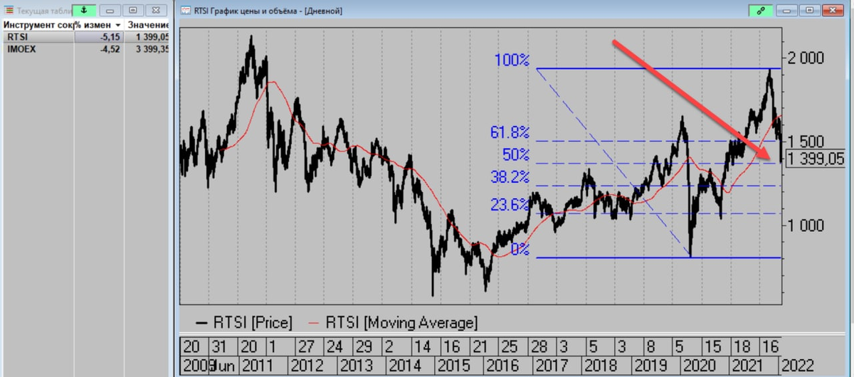 Во вторник 18 января российский рынок акций рухнул более чем на 7%. Такие акции, как акции Сбербанка падали в моменте больше 11% за день. Курс доллара устремился к 77. Почему это присходило? Что будет дальше? Можно читать и смотреть аналитику тех, кто ищет чёрных лебедей и оправдывается почему всё пошло в другую сторону. А можно смотреть аналитику где шорты открывались на 188800 по фьючу на РТС и предсказывался текущий обвал акций и движение по всем остальным активам. Что и предлагаю вам сделать. Смотрите и подписывайтесь на наш телеграм канал: https://t.me/ProfitGate Пост иллюстрирующий что произошло во вторник: Я очень очень давно не смотрел на всякие приблуды из классической техники. Так что "фибоначи" тут просто для наглядности. Сегодня у нас знаменательный день, поскольку слита ровна половина роста с лоёв 2020 года. И большая часть роста с лоёв осени 2020 года. А так же все инвесторы в широкий рынок покупавшие акции на любых уровнях в любой момент 2021 года сейчас в минусе