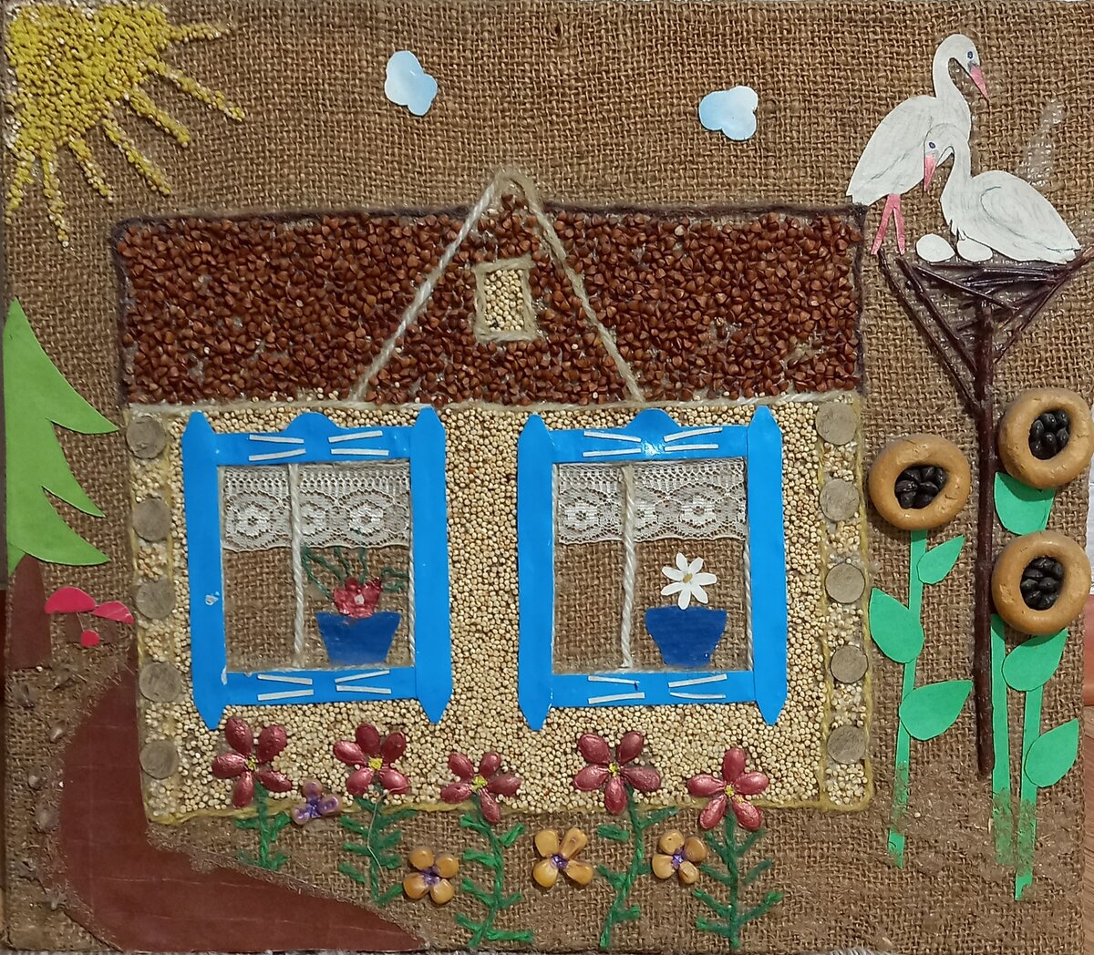 В стародавние времена в Древней Руси славяне старались уберечься от опасности вреда здоровью и счастью. И для этого люди обзаводились семейными талисманами. Такие обереги люди делали чаще всего сами, иногда заказывали мастерам. Правильно изготовленные, считалось, что они оказывали мощную защиту от дурного глаза, порчи, от болезни воров и бедности. Обереги были разными , и не сложными в изготовлении чаще всего это были бытовые вещи: тарелка, любая деревяшка, коготь или зуб добытого животного, всем нам знакомая подкова Так каждый предмет имел сакральное значение и мог защитить человека от определенной напасти. Использовались и руны. Это все дошло до нас в малой толике. Но хочу представить вам оберег сделанный бабушкой на свадьбу внучке более 13 лет назад. Материалы для изготовления все что есть на кухне. Крупы дала земля.Сушки, бублики, баранки, калачи сделал руками человек. Ход работы:Берем мешковину, бумагу крупы нитки, ветки, семечки хлебобулочные изделия. Все должно быть натуральным.