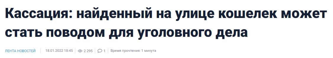 Если подобрать на улице потерянный кем-то кошелек и присвоить себе его содержимое - можно получить уголовное наказание по статье "Кража". Об этом свидетельствует судебная практика. В августе 2020 года россиянка нашла кошелек с деньгами и документами возле своего подъезда. Она решила не возвращать его владельцу и потратила деньги в размере 40 тыс. рублей на собственные нужды. Это была самая обычная женщина, не имеющая ранее судимостей. Каким-то образом обстоятельства совершенного действия были раскрыты и на нее завели уголовное дело по статье "Кража". Женщина пыталась доказать в суде, что совершила находку, поскольку у нее не было умысла совершать кражу, но суд принял решение, что это все же была кража, поскольку подсудимая не предприняла никаких действий для возврата находки государству или владельцу, как к этому обязывает ст. 227 ГК РФ. Суд вынес обвинительный приговор по статье "Кража" и присудил вернуть владельцу кошелька потраченные 40 тыс. рублей, а также заплатить штраф 25 тыс. р