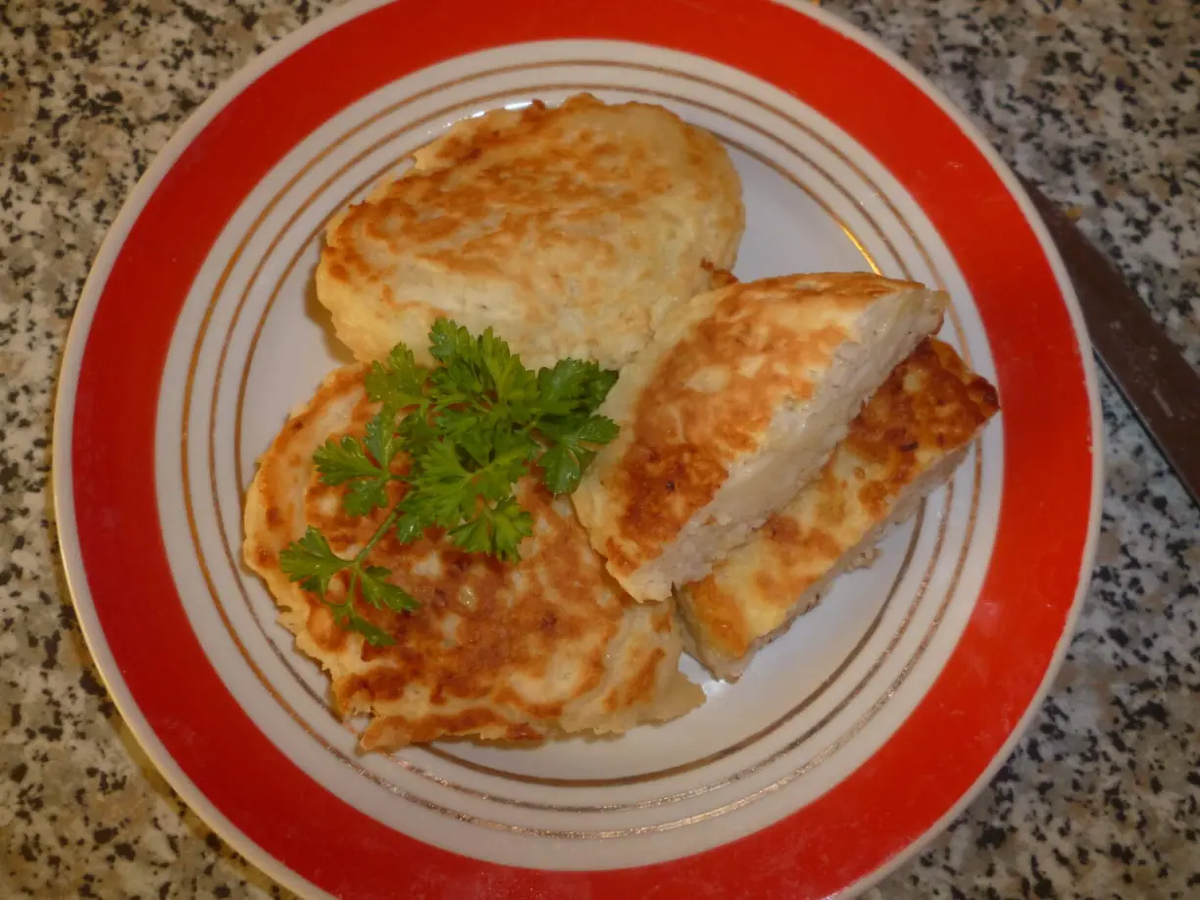 Тесто ложкой выложить на разогретую сковороду, в центр каждой оладьи поместить по ложке картофельного пюре и закрыть начинку оладьевым тестом. Выпекать