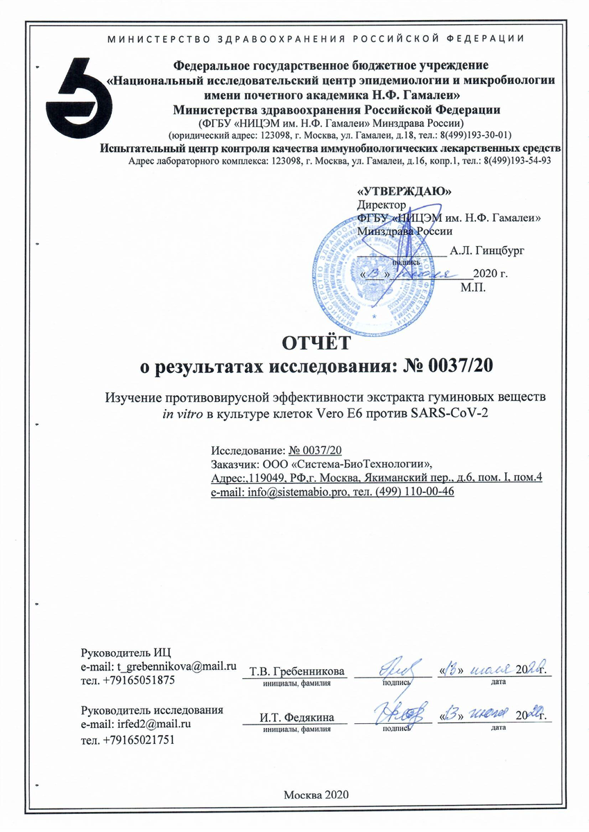 Проблема ОМИКРОН - соvid Профилактика заболевания за счет гумино-фульвовых веществ подтверждена исследованиями. Задача определение более эффективного анативирусного препарата из сочетания гуминовых веществ: солей гуминовых кислот, фульвовой и гиматомелановой кислот. Отчет по исследованию института им. Академика Н.Ф.Гамалей Исследования показывают, что гуминовые препараты как профилактически, а также терапевтически эффективны для лечения вирусных и бактериальных заболеваний и их профилактики. Гуминовые препараты могут применяться профилактически как антивирусные, потому что их присутствие в крови, на коже и в КЖТ человека нарушает способность вируса прикрепляться к клетке-хозяину, проникать в клетку-хозяина, и воспроизводить себя. Научные исследования показали, что, если в клетки-хозяина вирус проникают до введения гуминовые препаратов, воспроизводственный процесс вируса в клетке-хозяине с появлением молекул гуминовых препаратов остановливается. ОДНАКО, если он латентно
