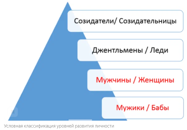 Обратите внимание, что первая прослойка, где мужчин этого уровня можно назвать мужиками, а женщин – бабами, самая многочисленная. Таких людей не только на СЗ, но и в обществе подавляющее большинство.