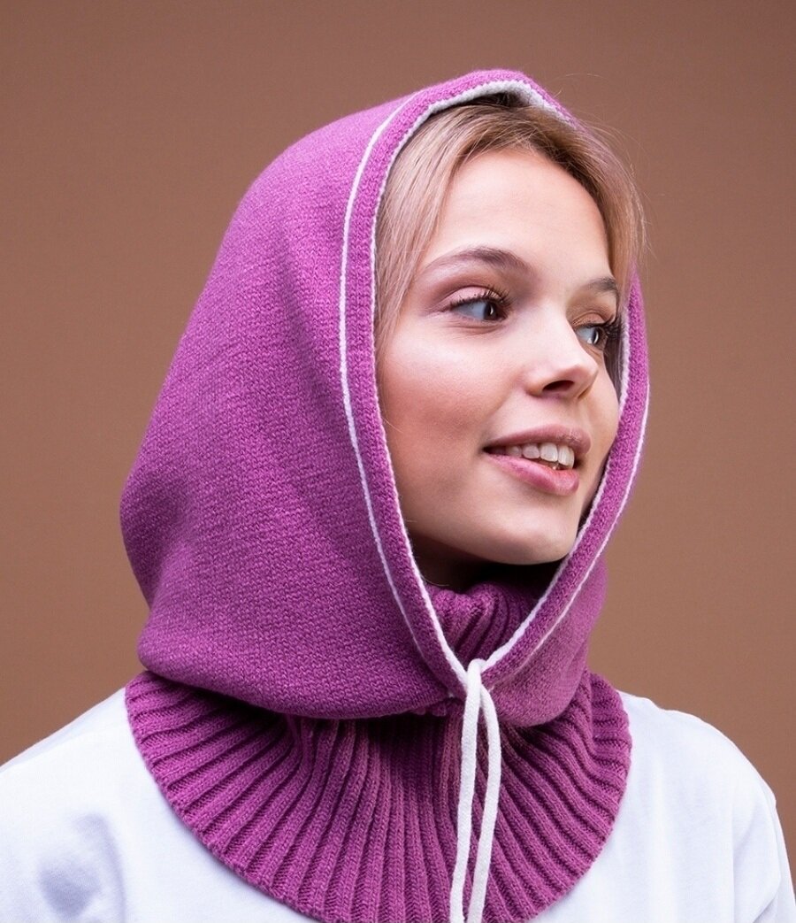 - Симпатичный капор сиреневого цвета с белым кантом у лица. По линии лица кулиска, в которую продет шнурок, стягивая шнурок, можно регулировать ширину выреза. Шейная часть связана в резинку, она похожа на воротник свитера. Такой капор отлично будет смотреться и с пальто, и с курткой.