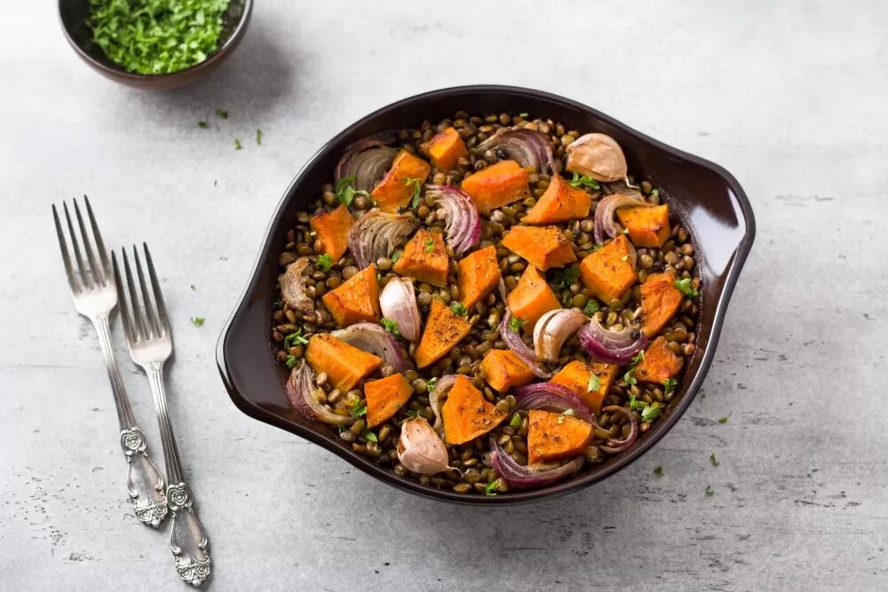 Секрет этого сытного блюда из чечевицы с тыквой и вкусным запечённым луком в том, что готовится оно исключительно в духовке, а всё что запекается в духовке получается гораздо вкуснее. В этом рецепте чечевица с овощами сначала томится в закрытом виде, а в финале - запекается, приобретая этот особенный вкус и аромат запечённых овощей. Как приготовить запечённую чечевицу с тыквой? Ингредиенты: