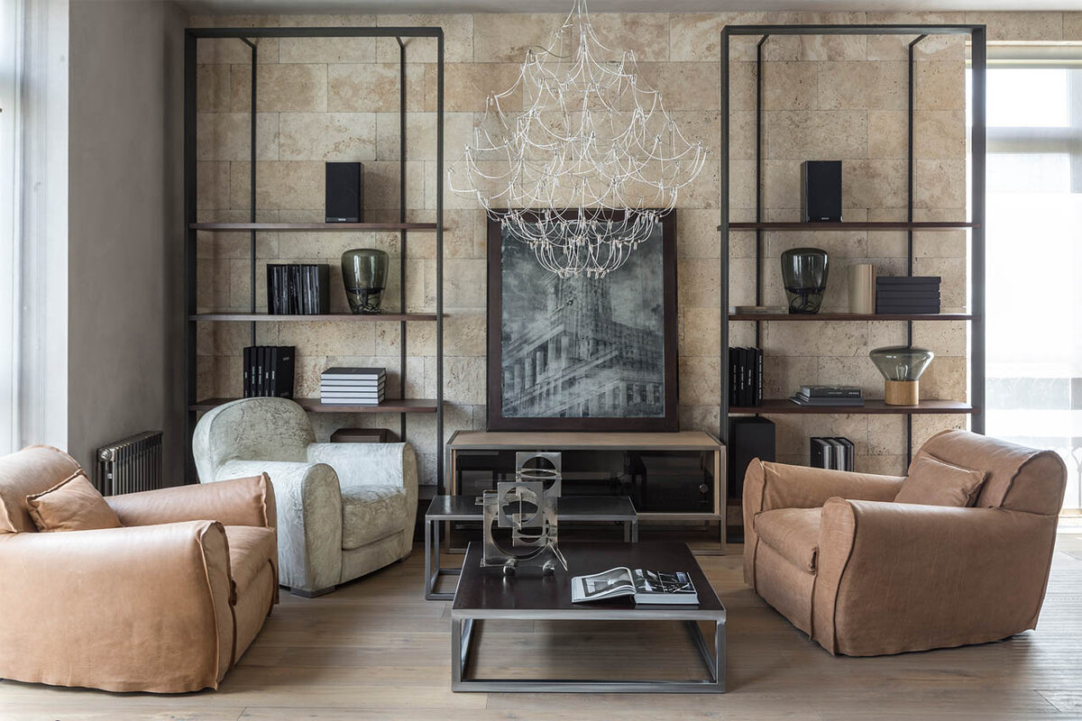 Когда Нина Зайцева познакомилась с заказчиками, она сразу поняла – работа с этими клиентами будет интересной и выходящей за рамки традиционных представлений. Одним из первых вопросов, который они задали, был: «А можно включить в проект граффити?» От граффити в итоге отказались, но в интерьере появилось множество дерзких и стильных решений. Работе над собственно интерьером предшествовало продумывание планировки. Изначально квартира рассчитывалась на одного владельца, но молодой человек в перспективе мог обзавестись семьей и ребенком, и эти сценарии следовало заложить в концепцию. Самой большой проблемой стал Т-образный коридор. Его пропорции удалось скорректировать за счет облицовки зеркалами и монтажа дверей под потолок, выполненных в пандан стенам: они смотрятся скорее как декоративные панели. Заказчики, родители молодого человека, просили, чтобы Нина Зайцева создала трансформируемое пространство, при котором зоны гостиной, кухни и рабочего кабинета можно будет сделать более изолиров