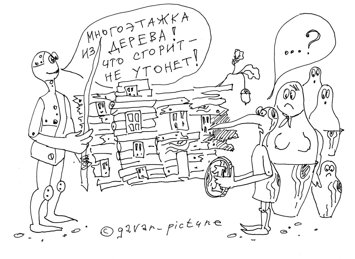 Сегодня нас радуют и веселят два человека. Первый - председатель Ассоциации деревянного домостроения (АДД). На первый взгляд он не сказал ничего смешного, но это только на первый. Цитата: «Первые деревянные многоэтажки могут построить в России уже в этом году». Ну, вроде от смеха ещё никто не корчится. Просто на ум приходят небоскрёбы из досок, сколоченные гвоздями «соточка». Или высоченные шедевры архитектуры из брёвен, построенные по старинным технологиям без единого гвоздя. Целые кварталы таких строений. Дом –«колодец» и раньше было название, а тут несколько этажей! А ещё рекламные проспекты от застройщика, где покупателям обещают отделку дома «под красное дерево», как это было модно при производстве «стенок» в СССР. Нет, планируется строить «без сучка, без задоринки» всего лишь четырёхэтажные здания. И вот тут некоторые начинают нервничать и задавать вопросы о пожарной безопасности в таких строениях. Ну, мы же про входящих в горящую избу русских женщин не зря хорошо помним. А тут а
